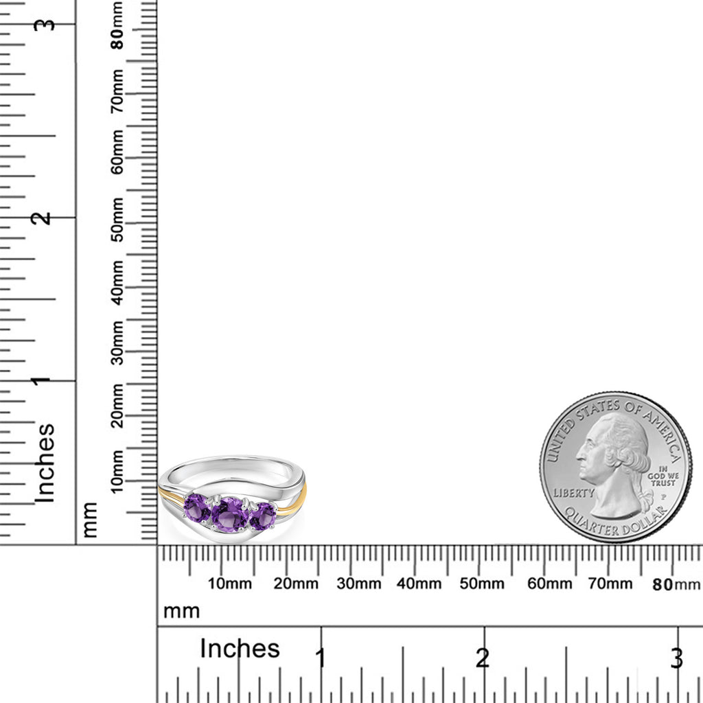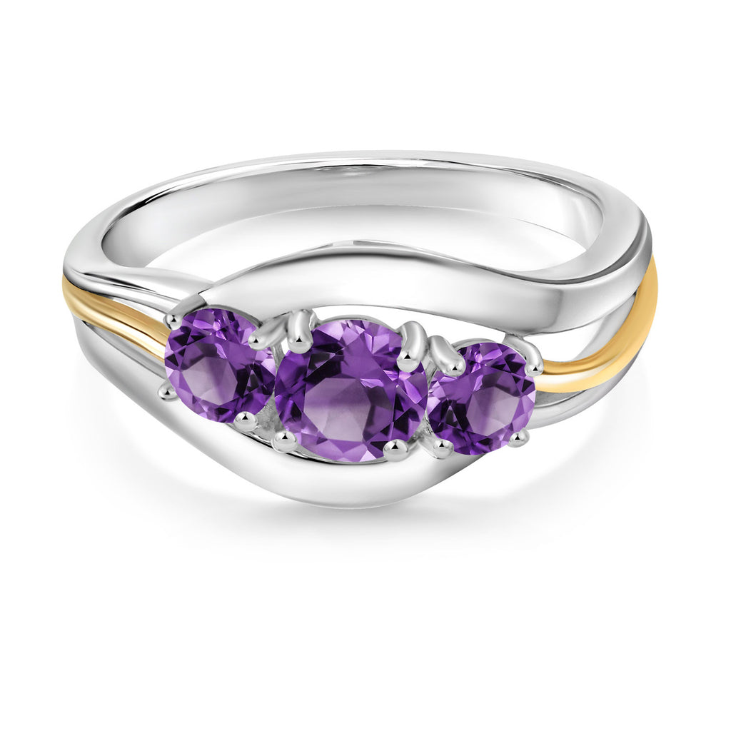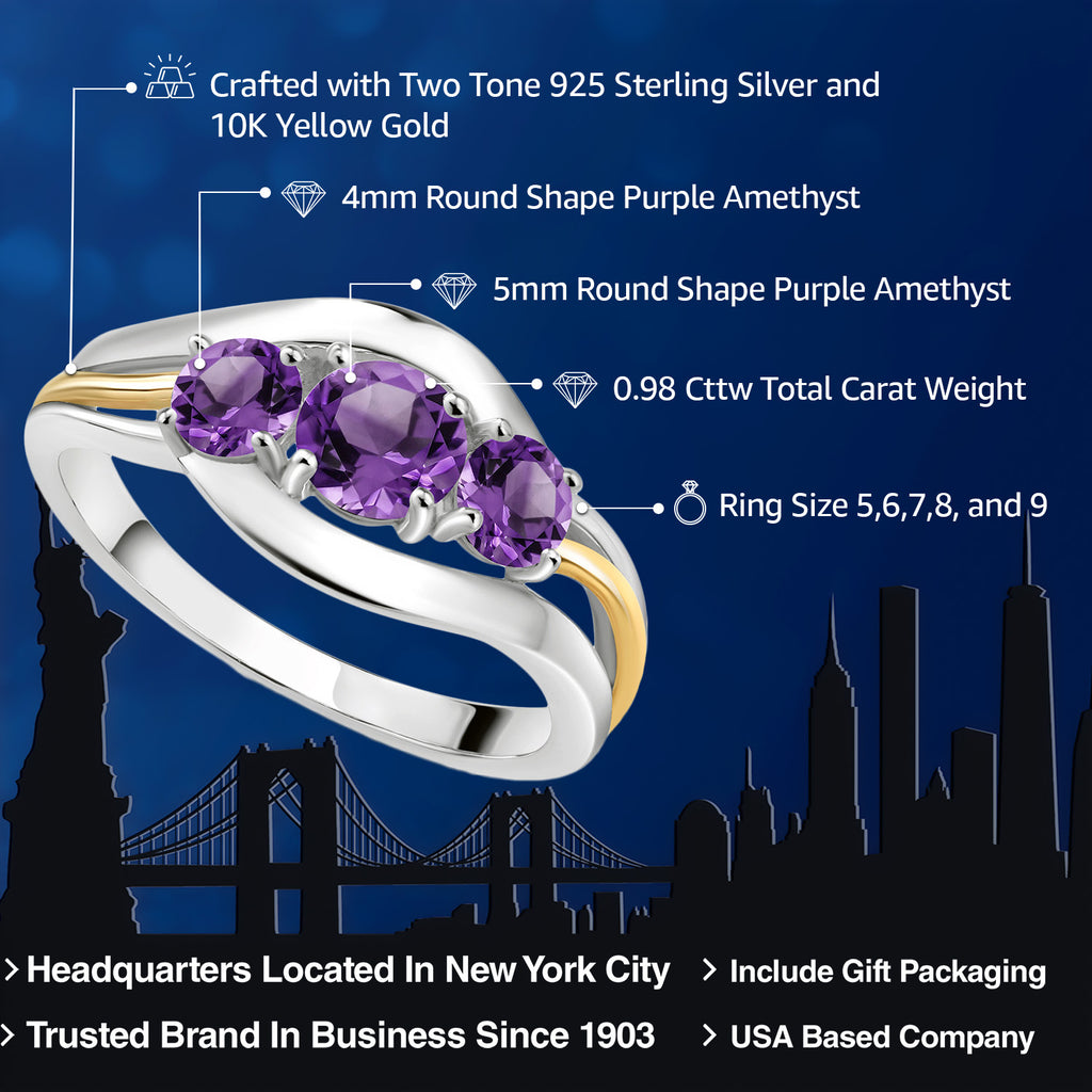 Purple Amethyst 3 Stone Ring For Women | 925 Sterling Silver and 10K Yellow Gold | 0.98 Cttw | Round 5MM and 4MM | Wedding Engagement Anniversary Promise Ring For Women