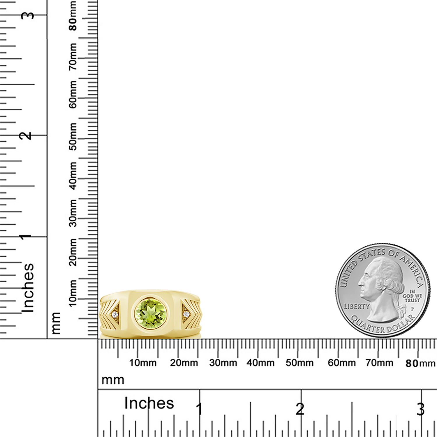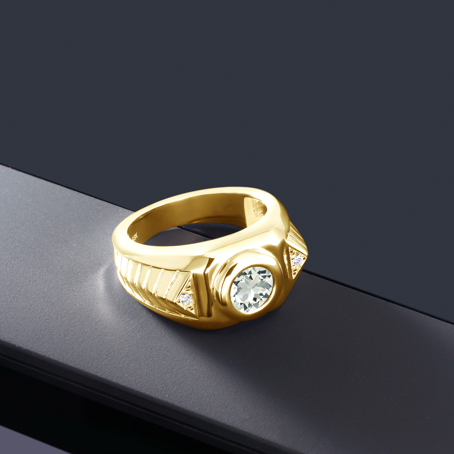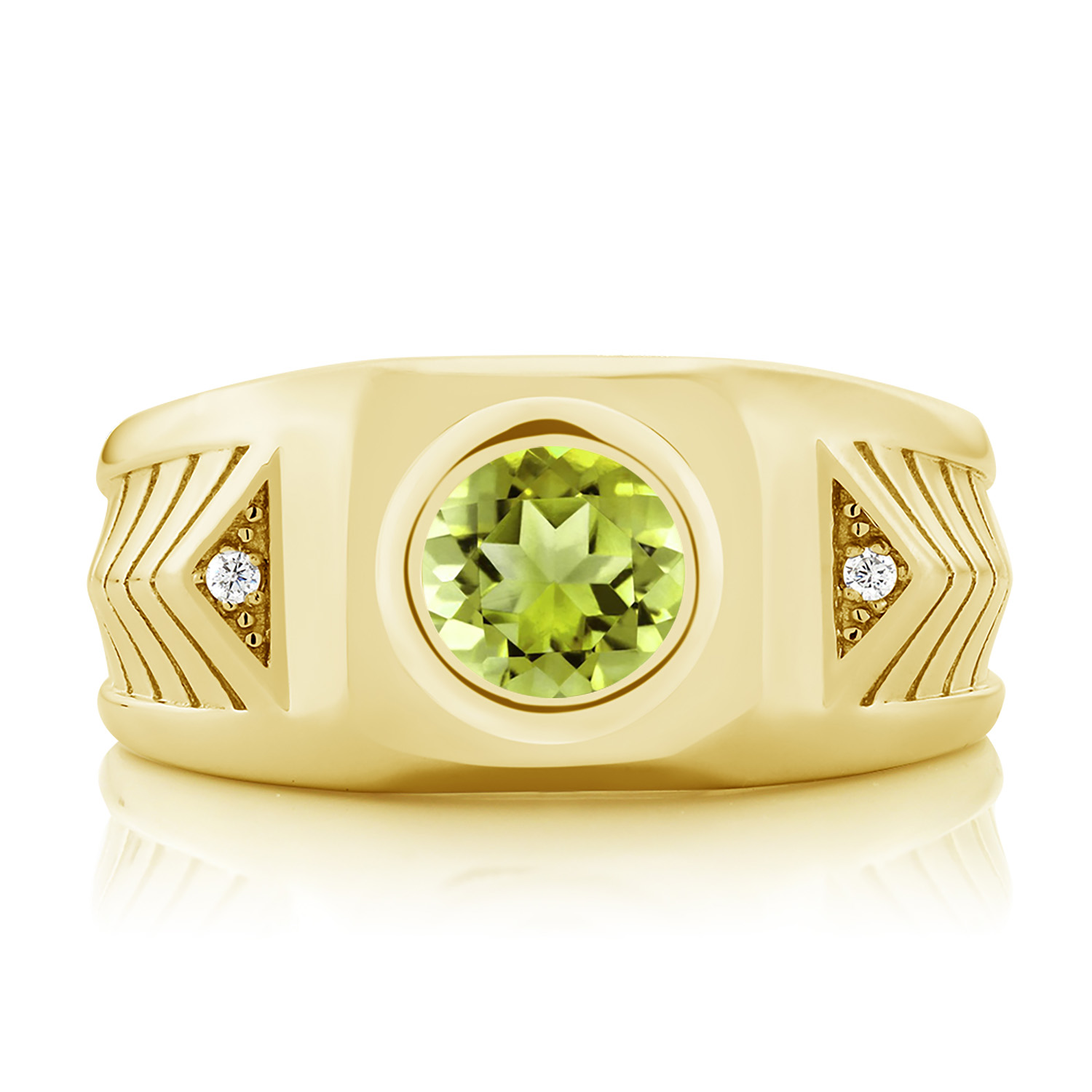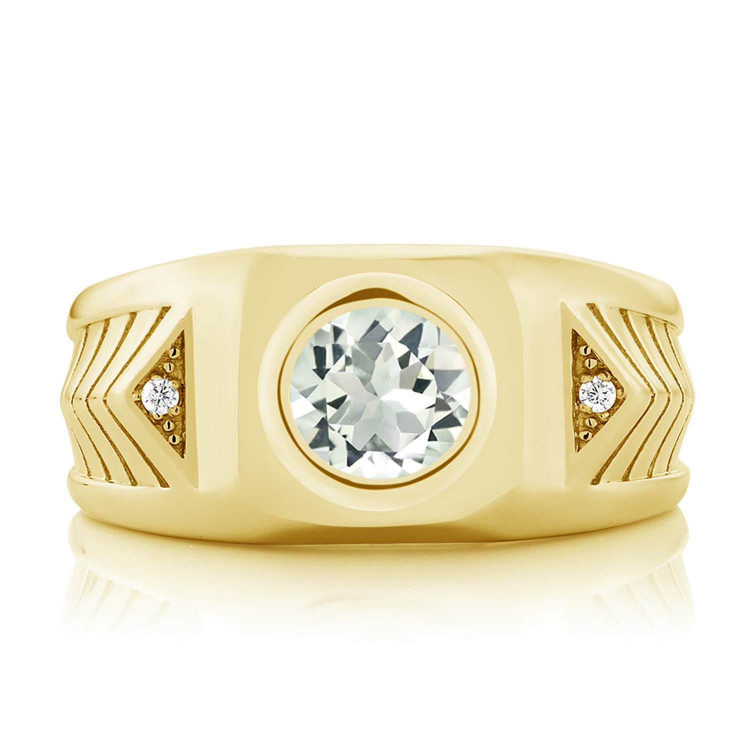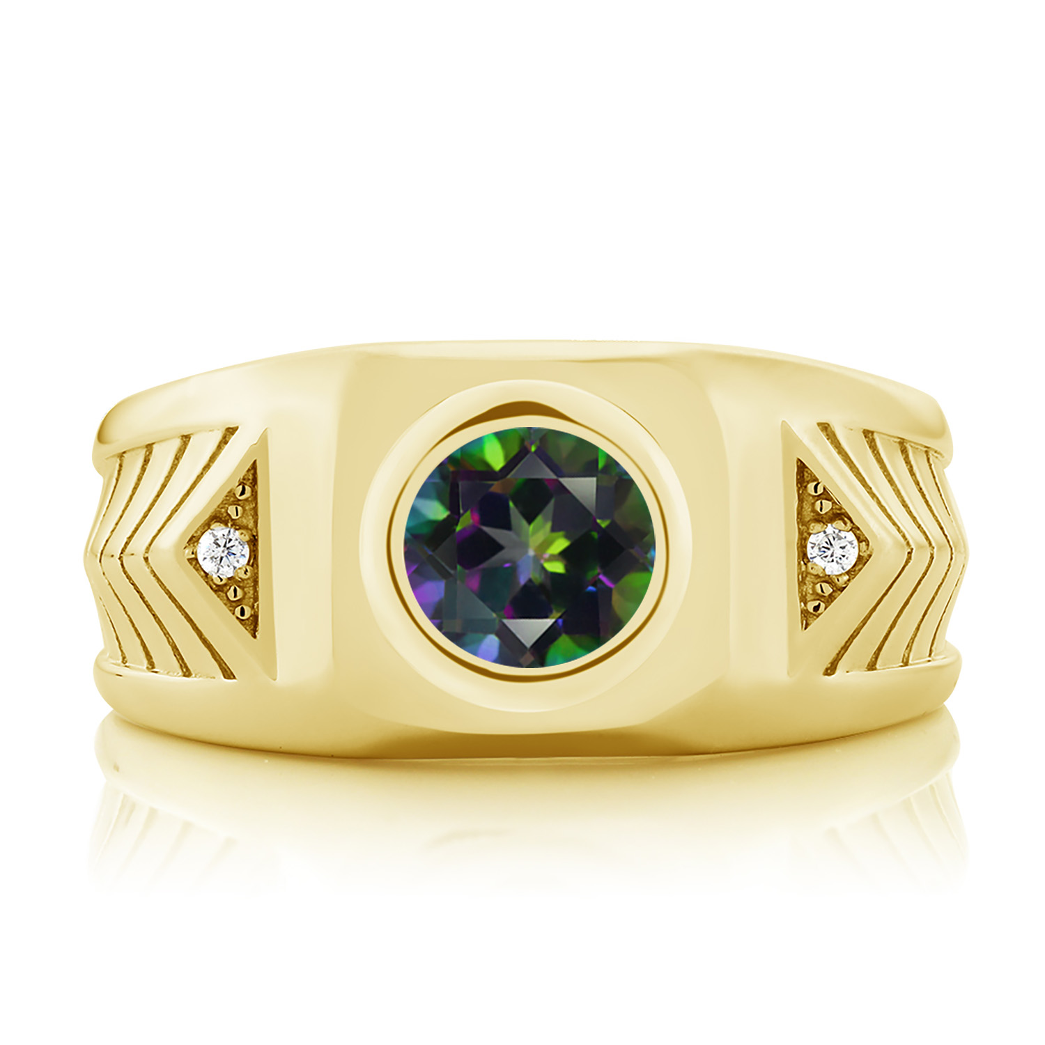 RADIANT WHITE ZIRCONIA ACCENTS: Premium white zirconia stones are precisely set into sharp triangle accents along each shoulder of the band. Their crystal-clear brilliance offers eye-catching shine without overpowering the centerpiece. Detailed chevron carvings introduce a structured, modern aesthetic—making this piece a standout blend of bold form, sparkling detail, and clean symmetry.