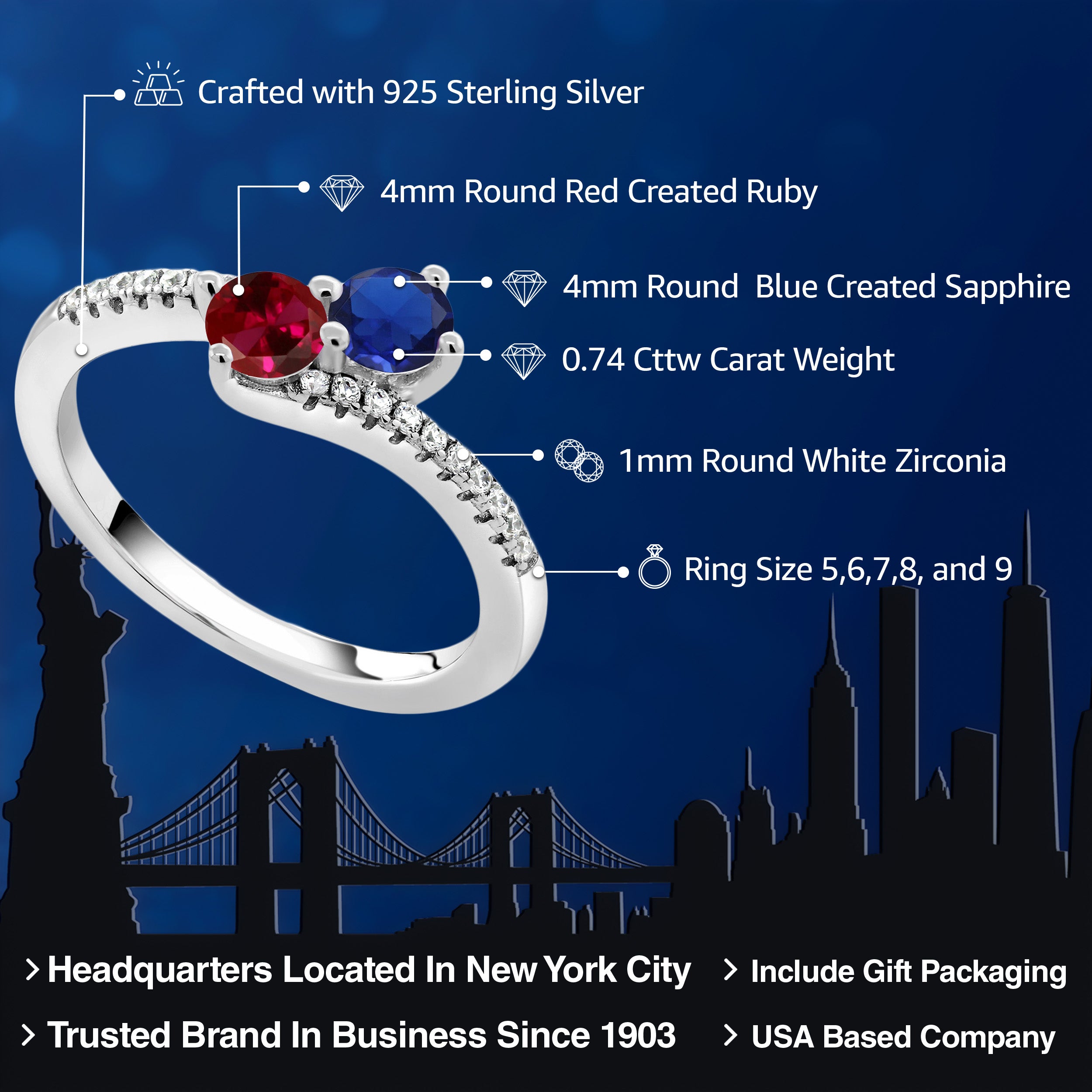 Two-Stone Bypass Ring for Women in 925 Sterling Silver | 4MM Round Gemstone Birthstone and Blue Created Sapphire | Crossover Anniversary Engagement Wedding Promise Ring | Sizes 5-9