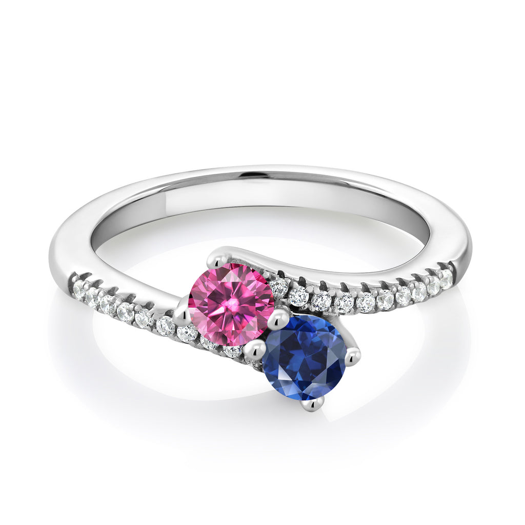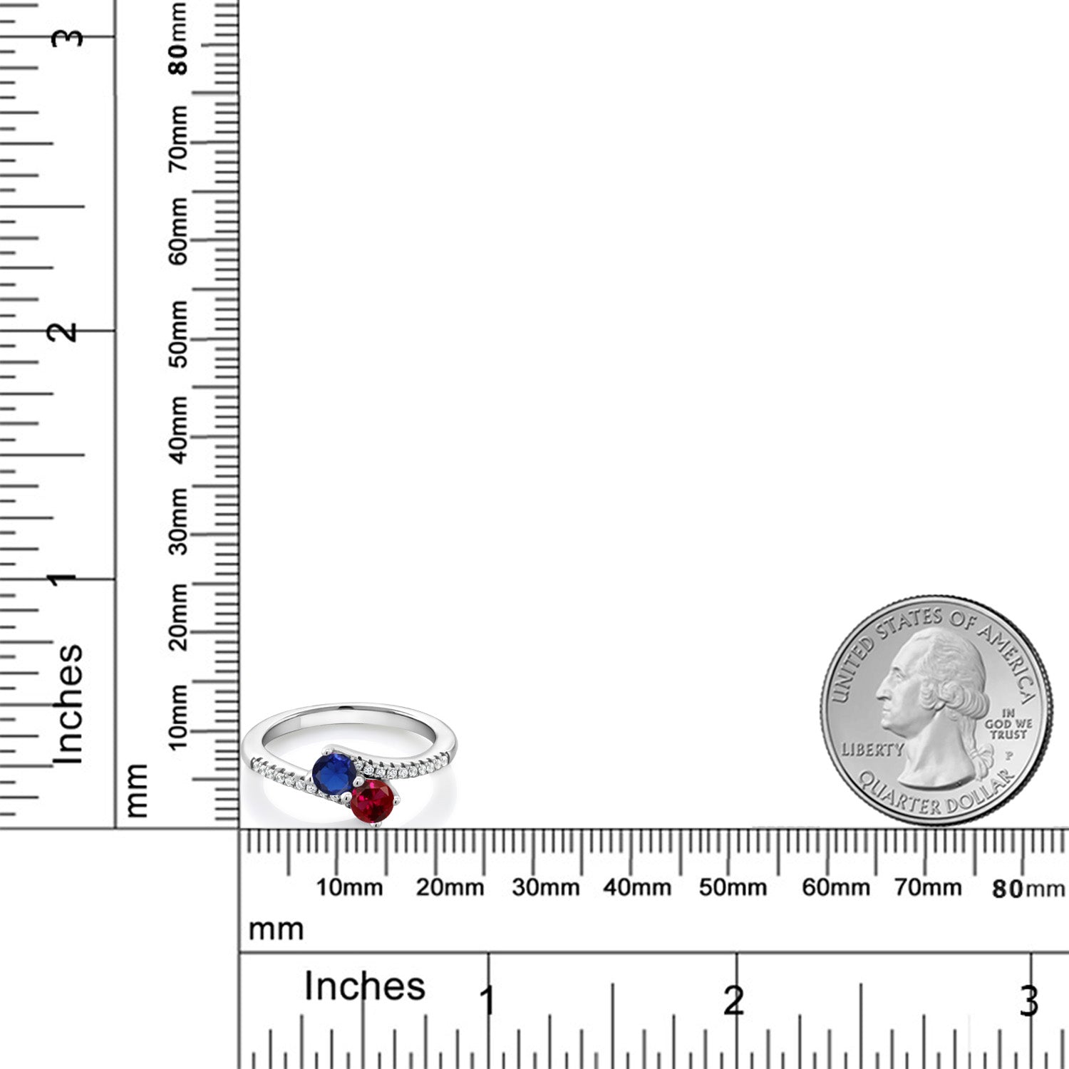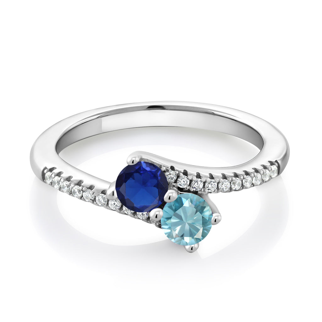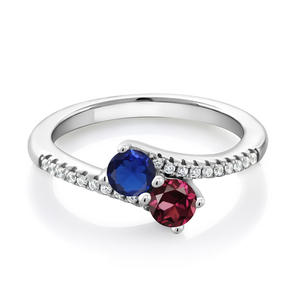 DUAL GEMSTONE ELEGANCE: This Two-Stone Bypass Ring captivates with a 4MM round gemstone birthstone alongside a 4MM blue created sapphire, evoking both personal significance and timeless elegance. The expertly cut stones catch the light, radiating a brilliance that enchants with every glance. Perfect for expressing individuality while celebrating cherished moments, it offers a harmonious blend of vibrant color and striking clarity.