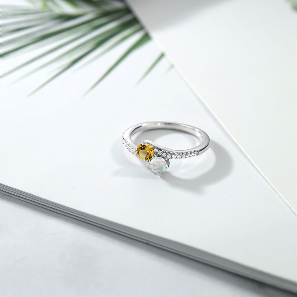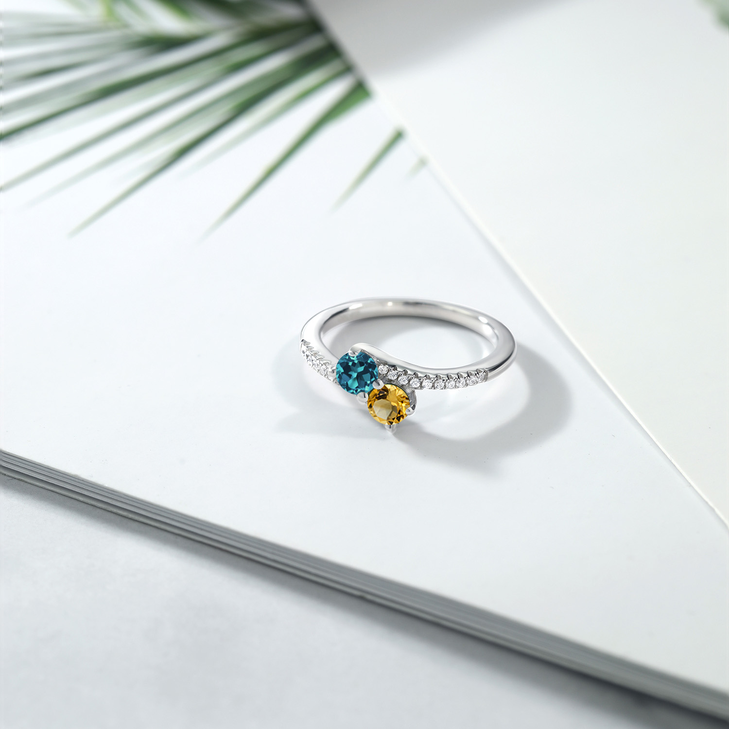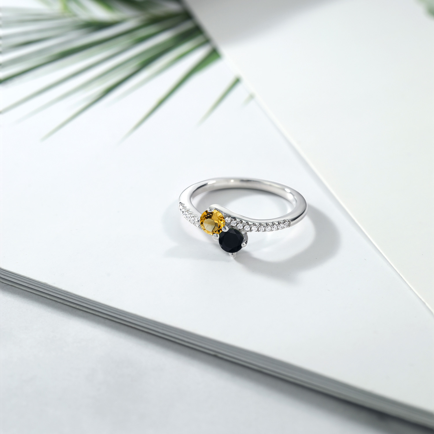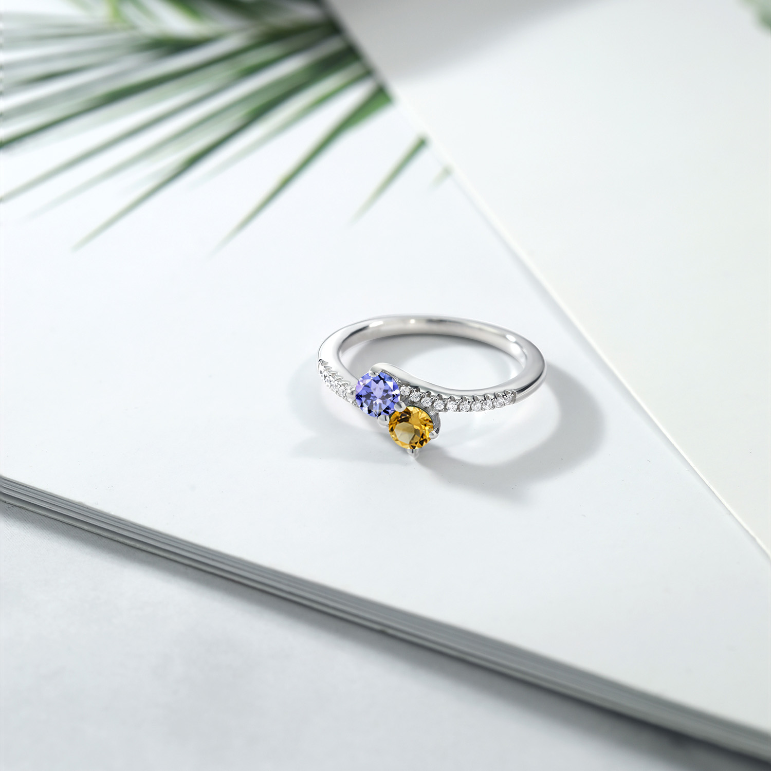 DUAL-GEMSTONE ELEGANCE: This exquisite two-stone bypass ring features a captivating 4MM round birthstone paired with a vibrant yellow citrine, symbolizing a harmonious blend of emotions and joy. The gems’ perfectly symmetrical round cut enhances their inherent clarity and brilliance, ensuring they catch light from every angle. Every piece is carefully chosen to create a sentimental piece that speaks to personal milestones, making it perfect for expressing love and commitment.