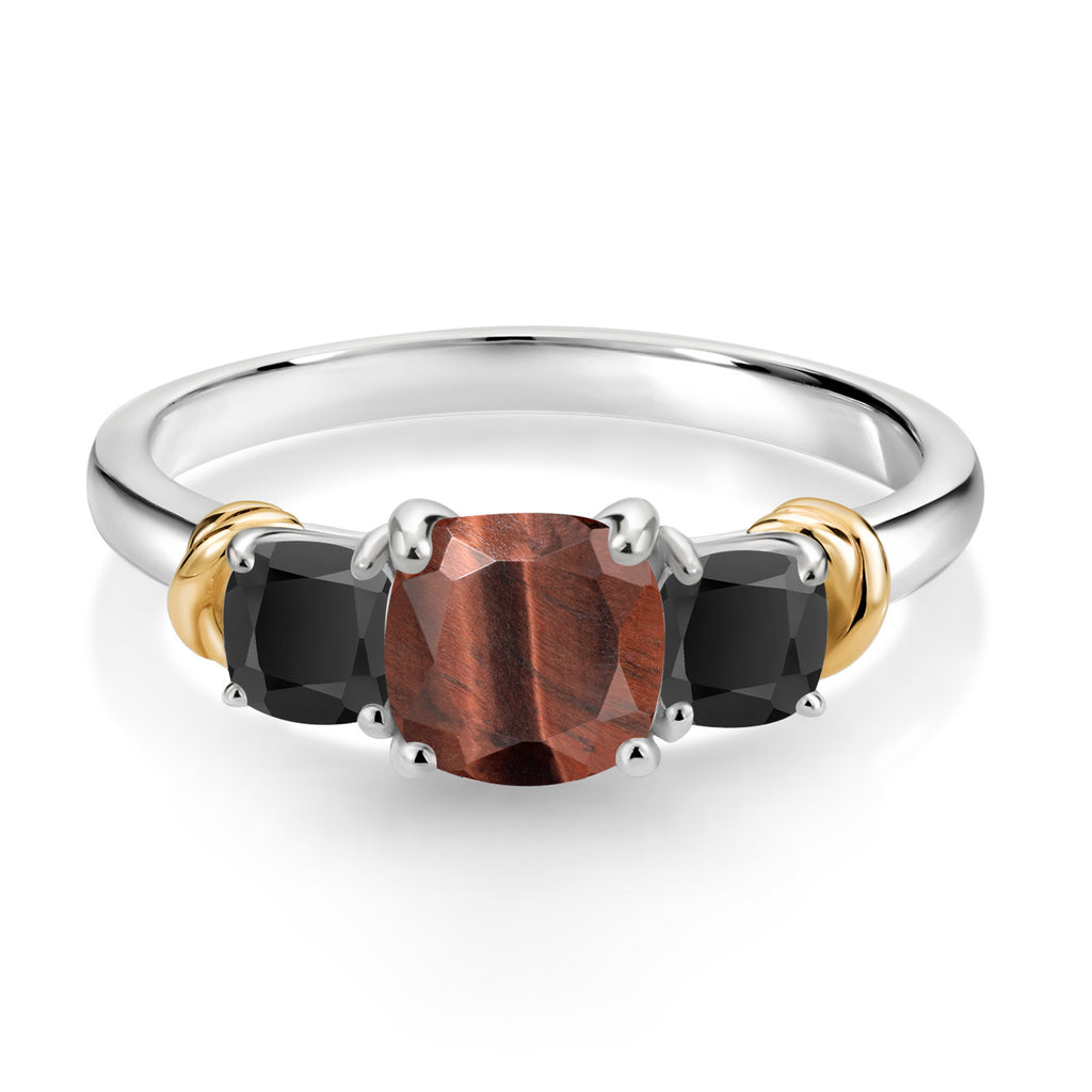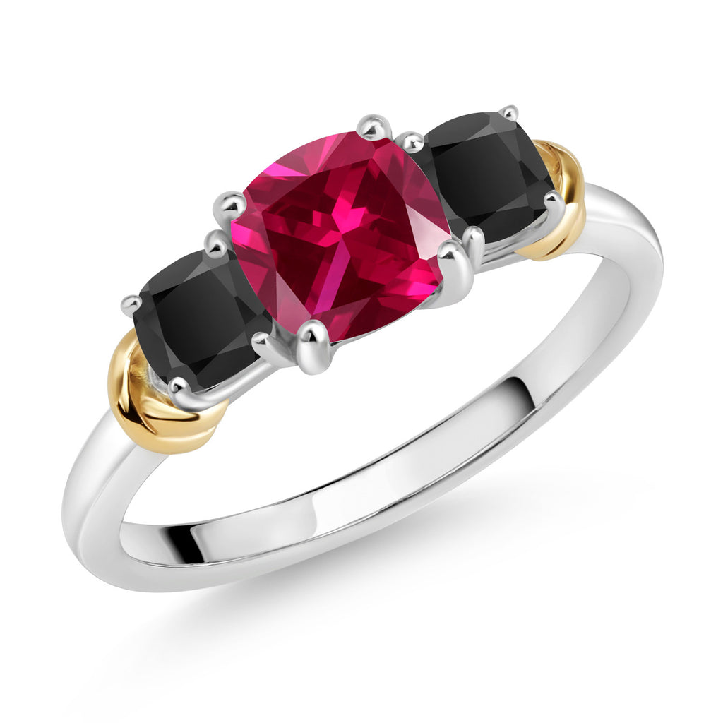 Two-Tone Gemstone Birthstone and Black Onyx 3-Stone Engagement Ring for Women | 925 Silver and 10K Yellow Gold | Cushion Cut 6MM and 4MM | Fine Jewelry for Wedding Anniversary | Sizes 5-9