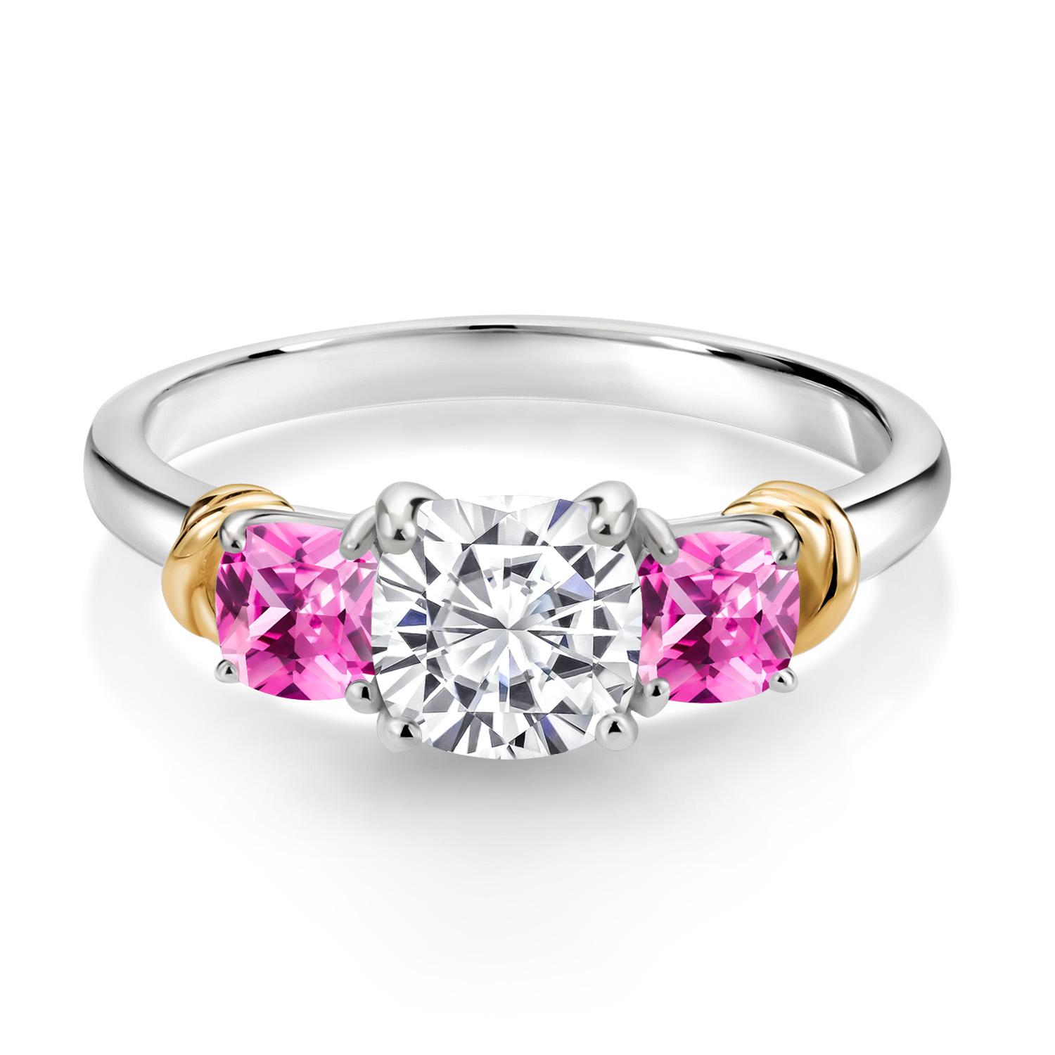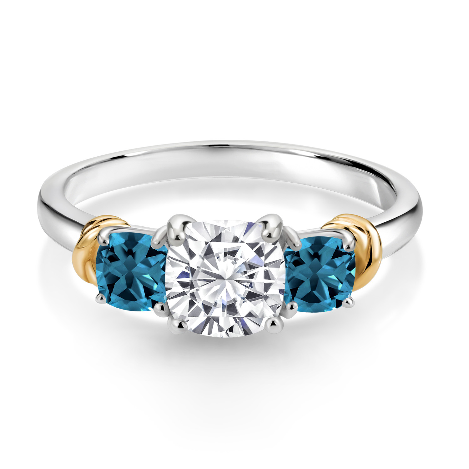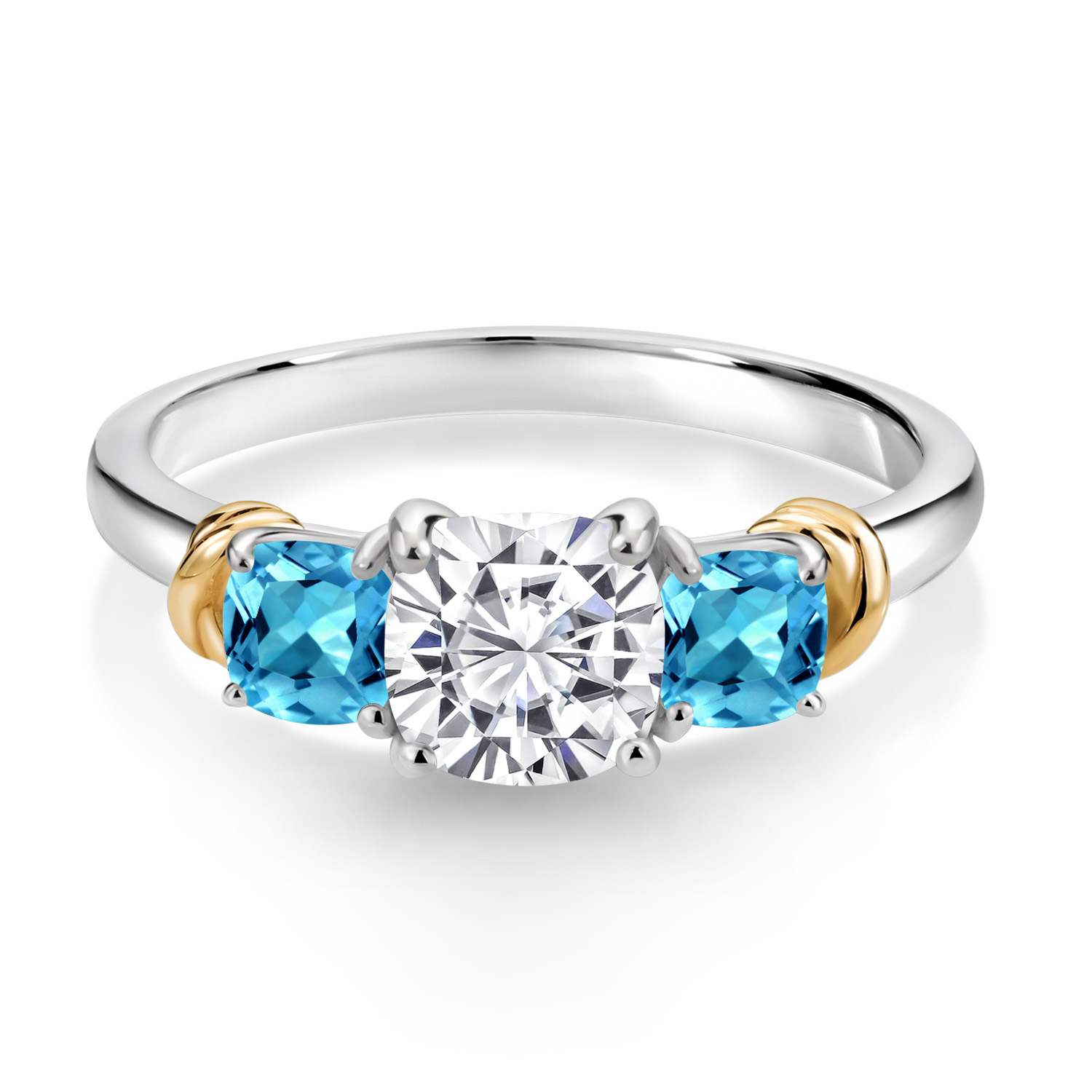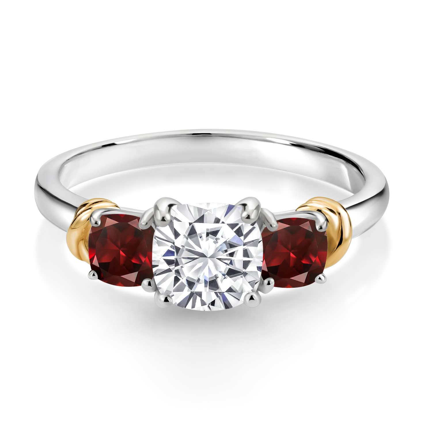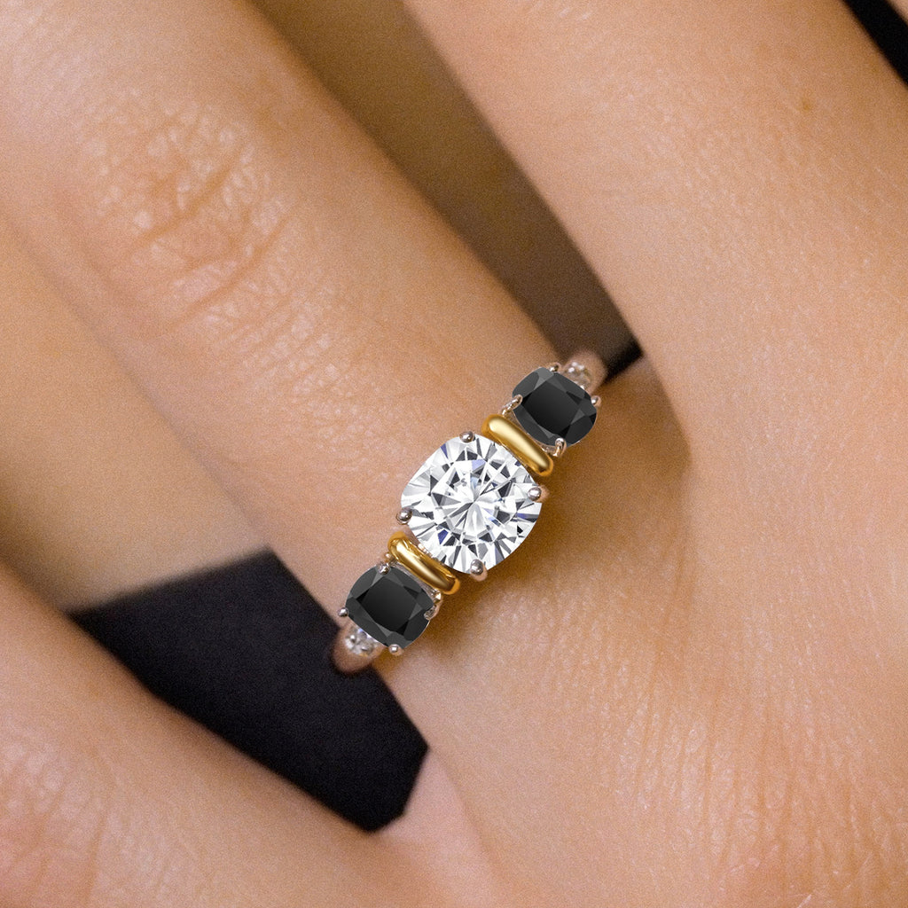 Two-Tone White Moissanite and Gemstone Birthstone 3-Stone Engagement Ring for Women | 925 Silver and 10K Yellow Gold | Cushion Cut 6MM and 4MM | Fine Jewelry for Wedding Anniversary | Sizes 5-9