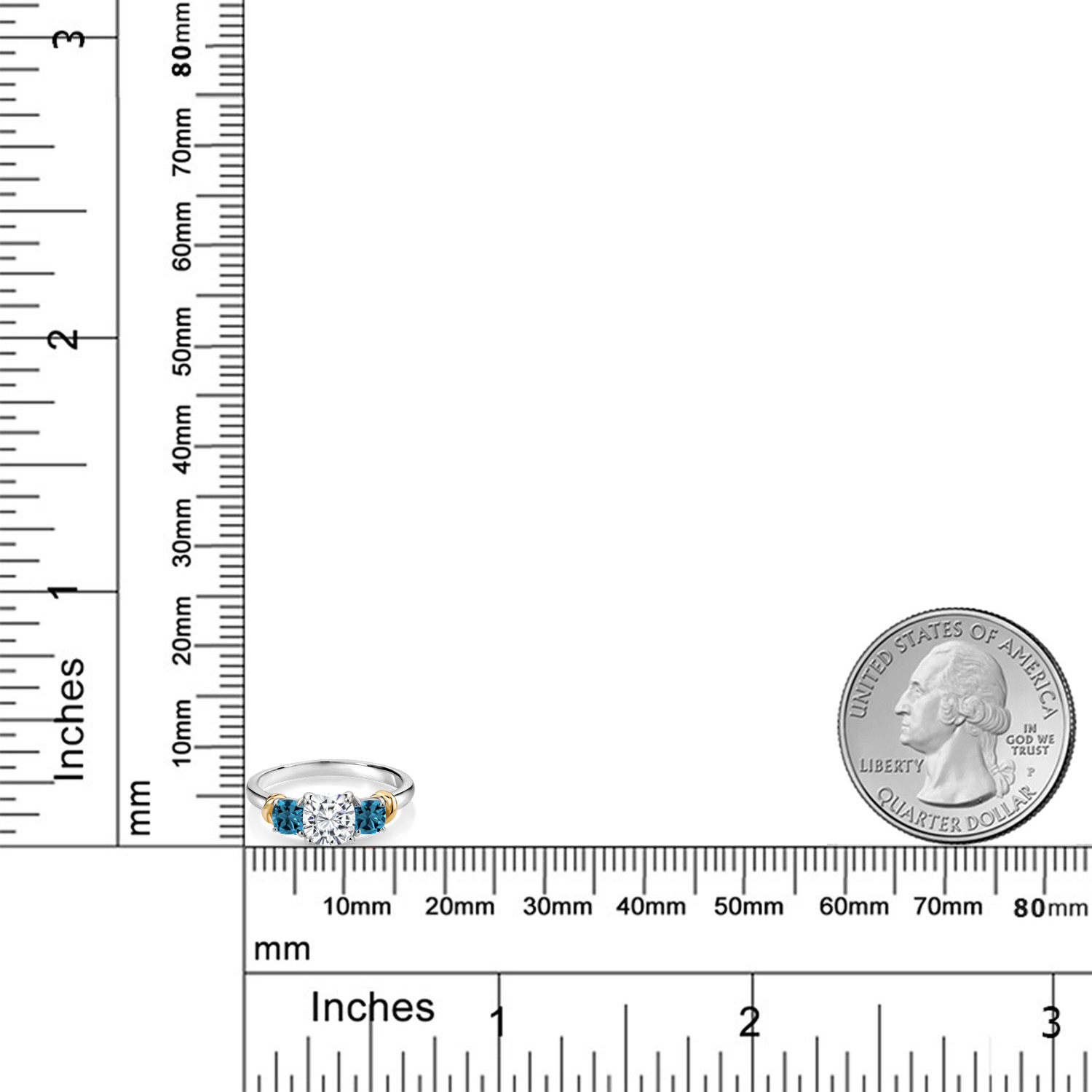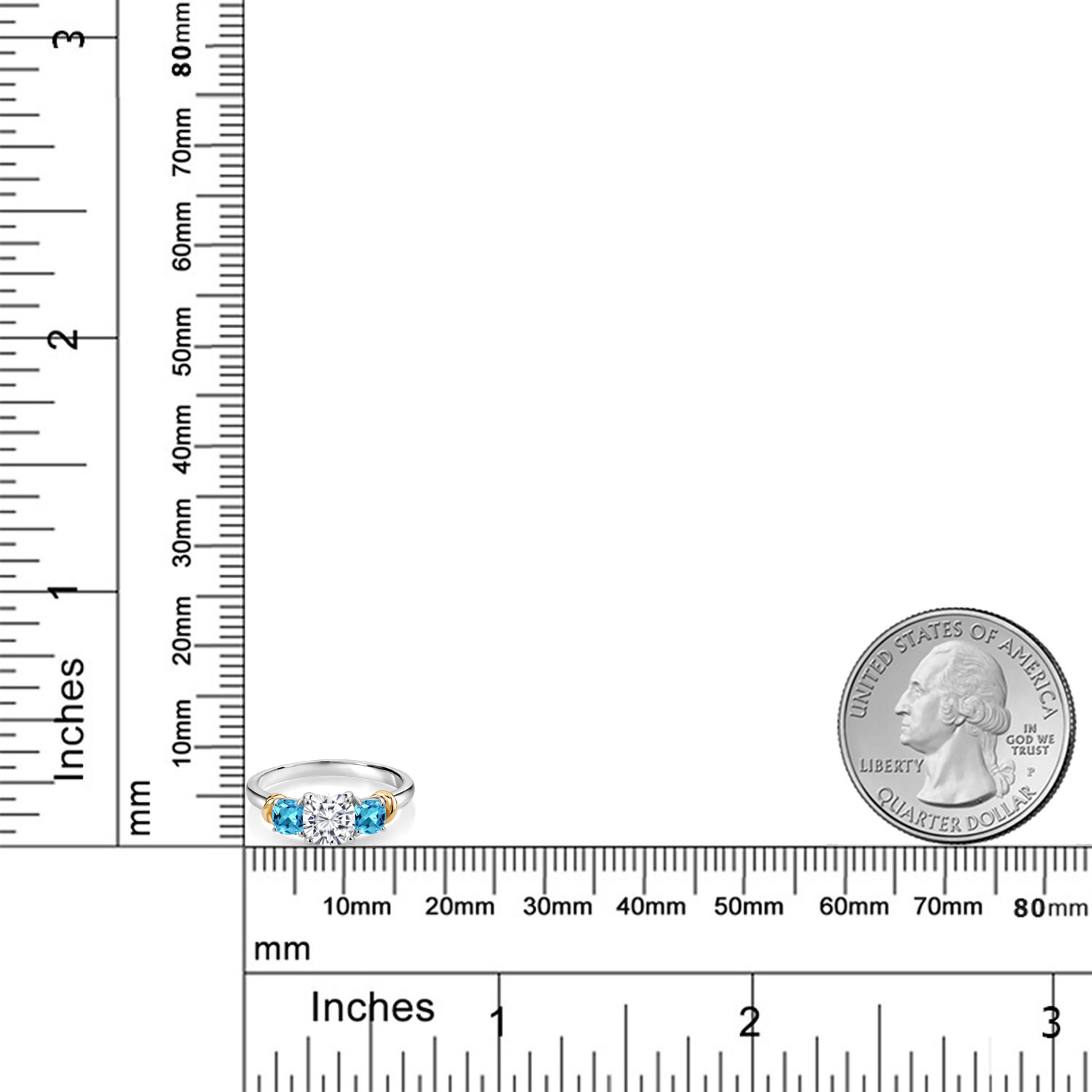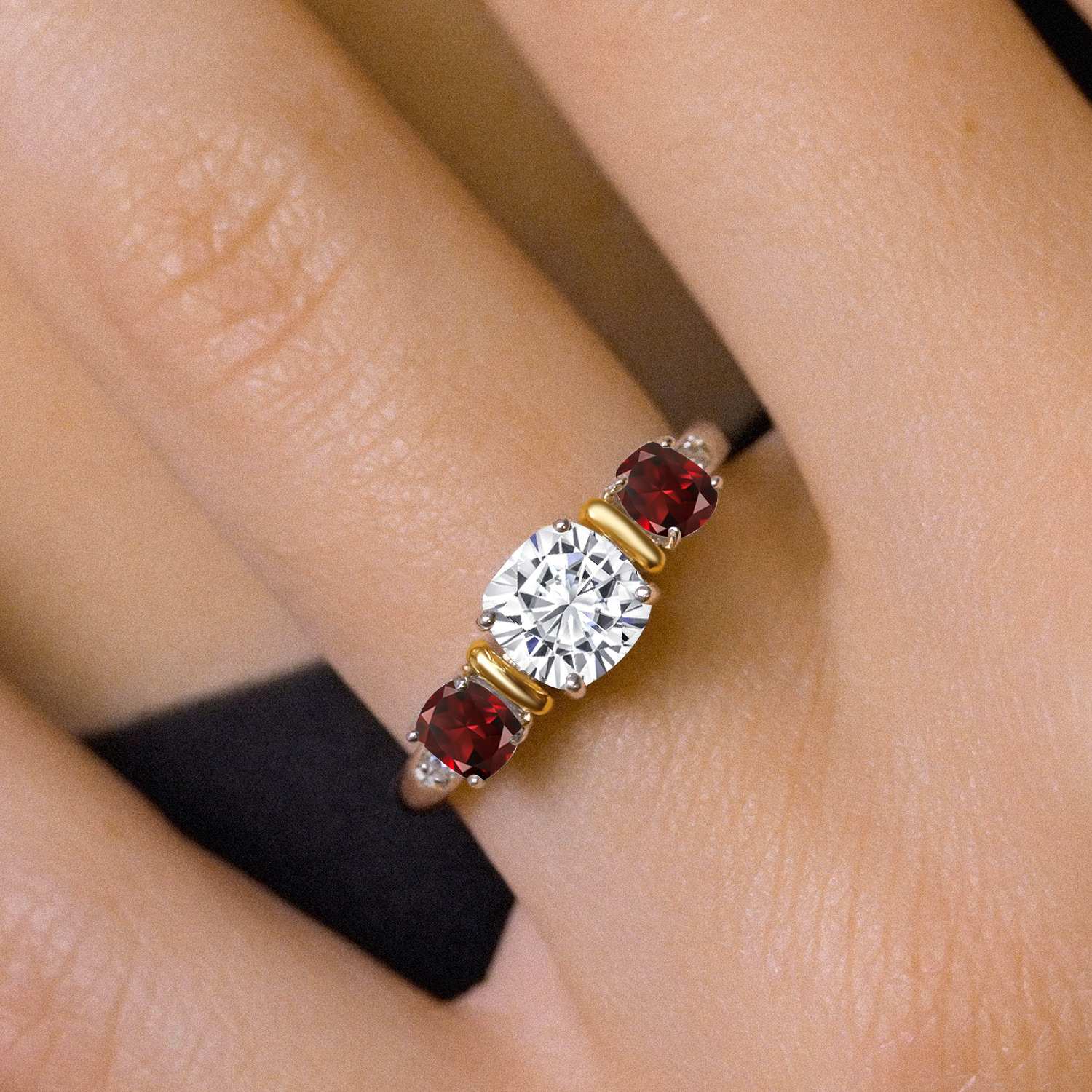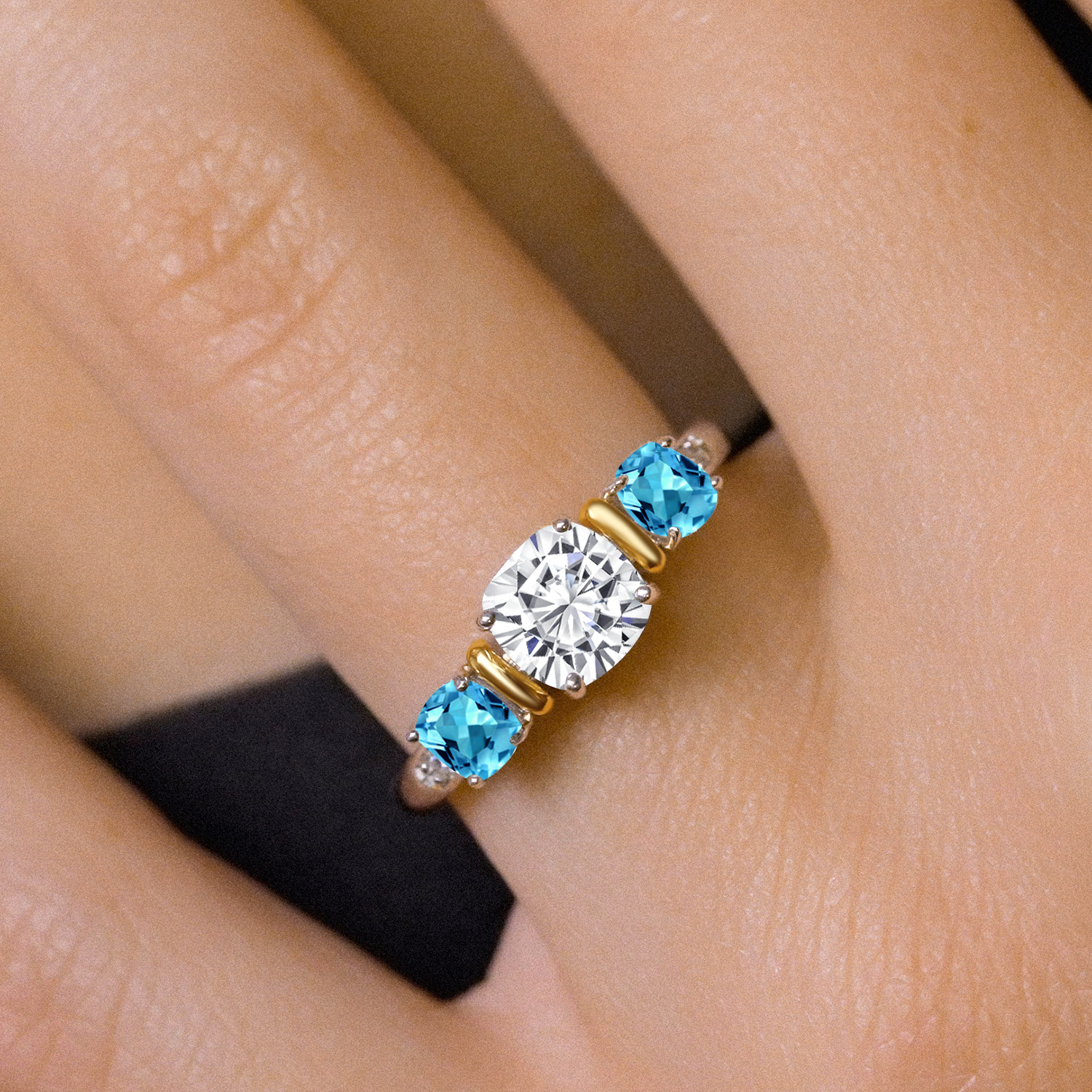 Two-Tone White Moissanite and Gemstone Birthstone 3-Stone Engagement Ring for Women | 925 Silver and 10K Yellow Gold | Cushion Cut 6MM and 4MM | Fine Jewelry for Wedding Anniversary | Sizes 5-9