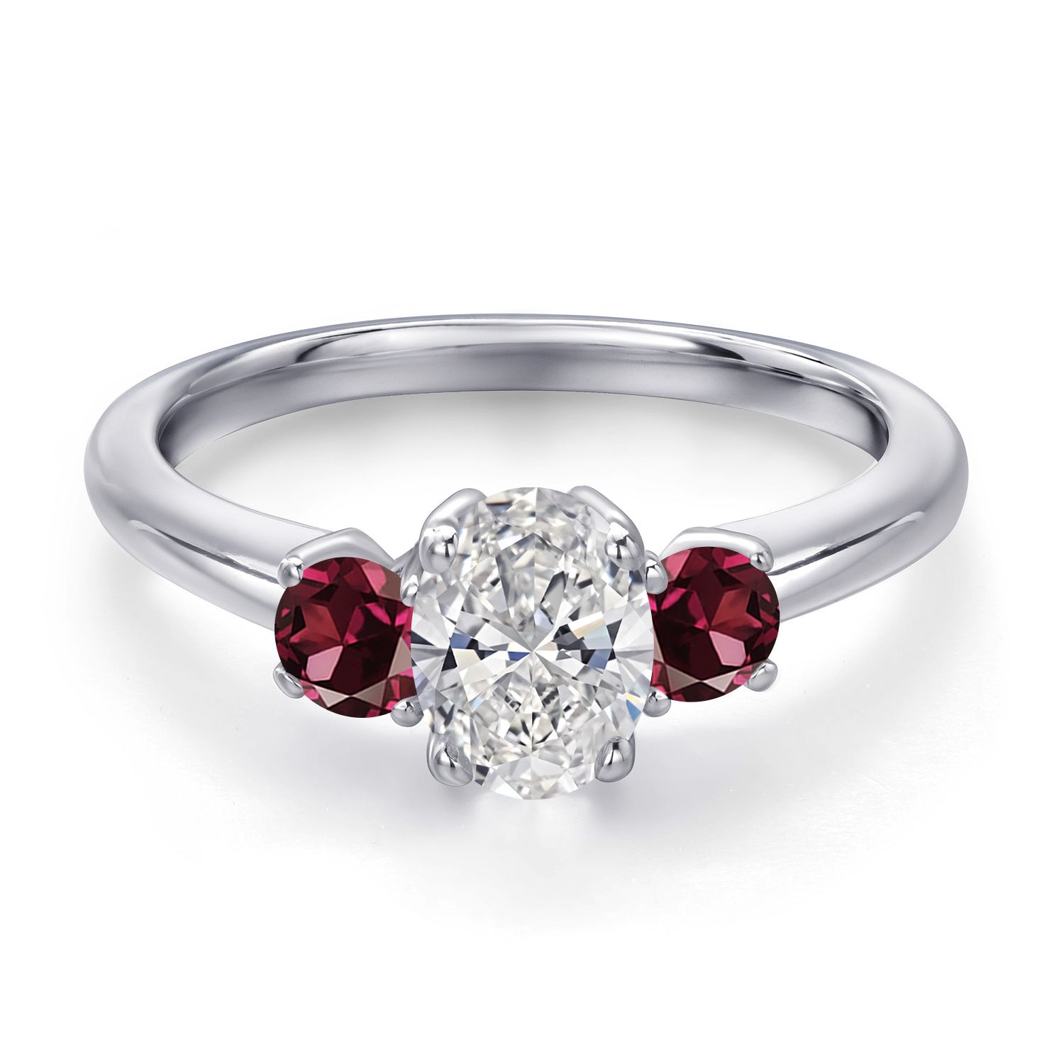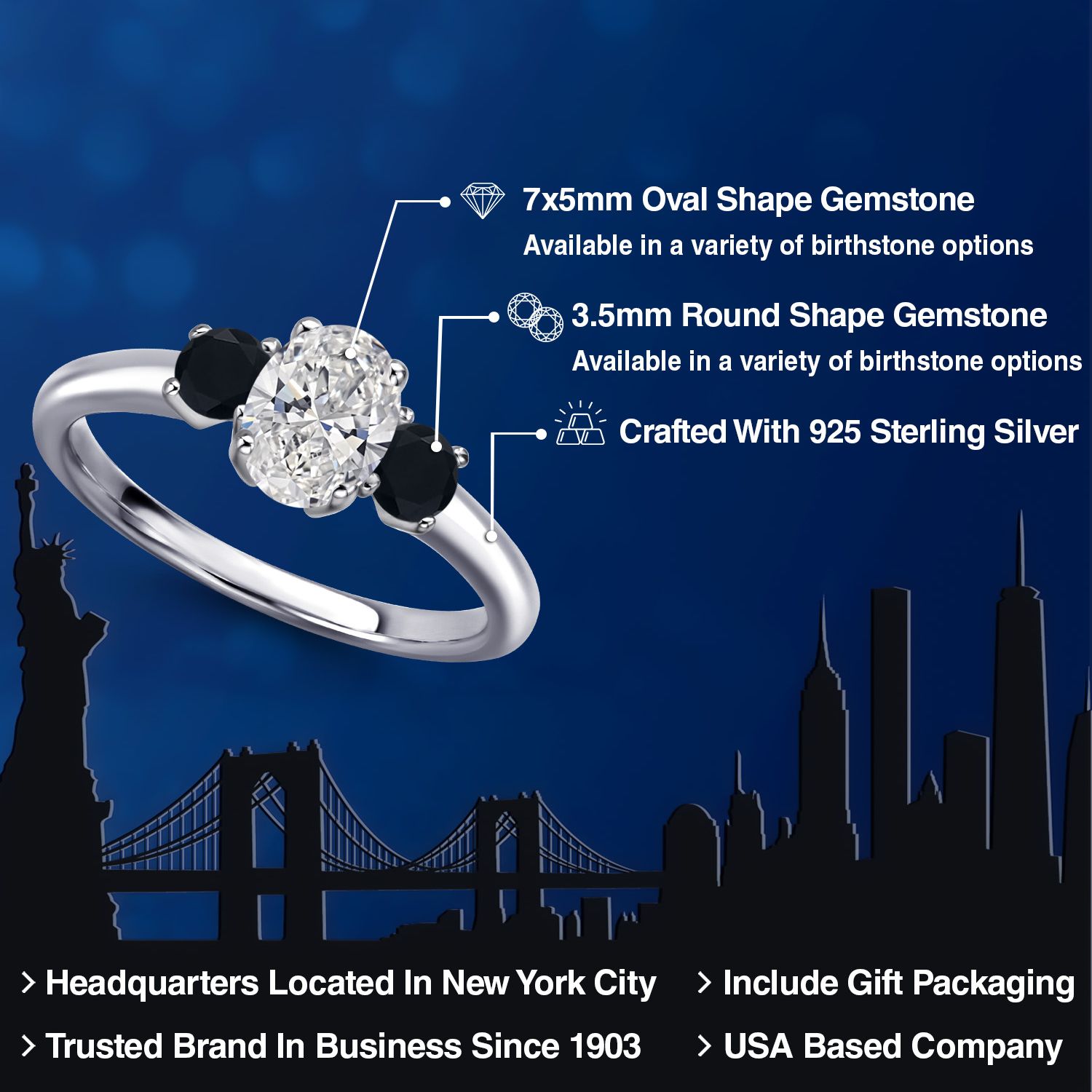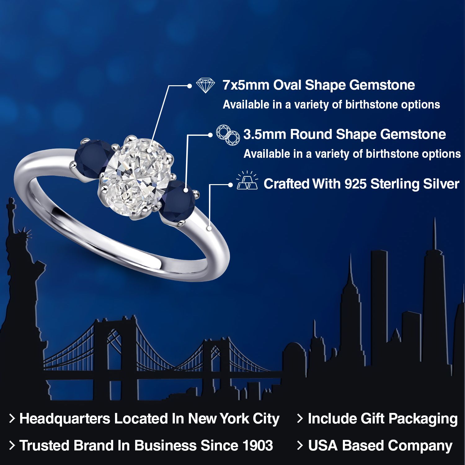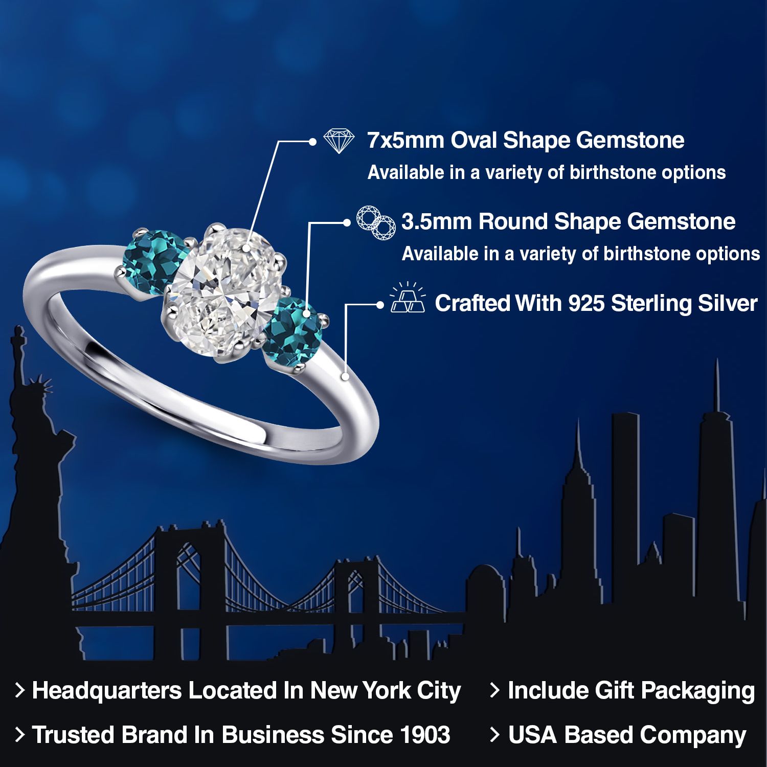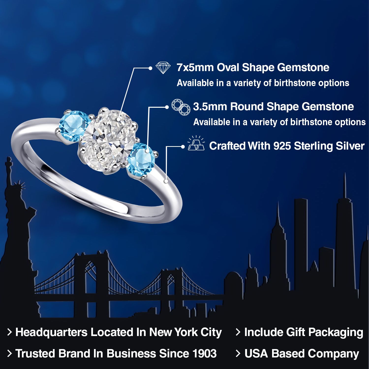 White Lab Grown Diamond and Gemstone Birthstone 3-Stone Engagement Ring for Women in 925 Sterling Silver | Oval 7X5MM and Round 3MM | Wedding Anniversary Promise Ring | Sizes 5, 6, 7, 8, 9