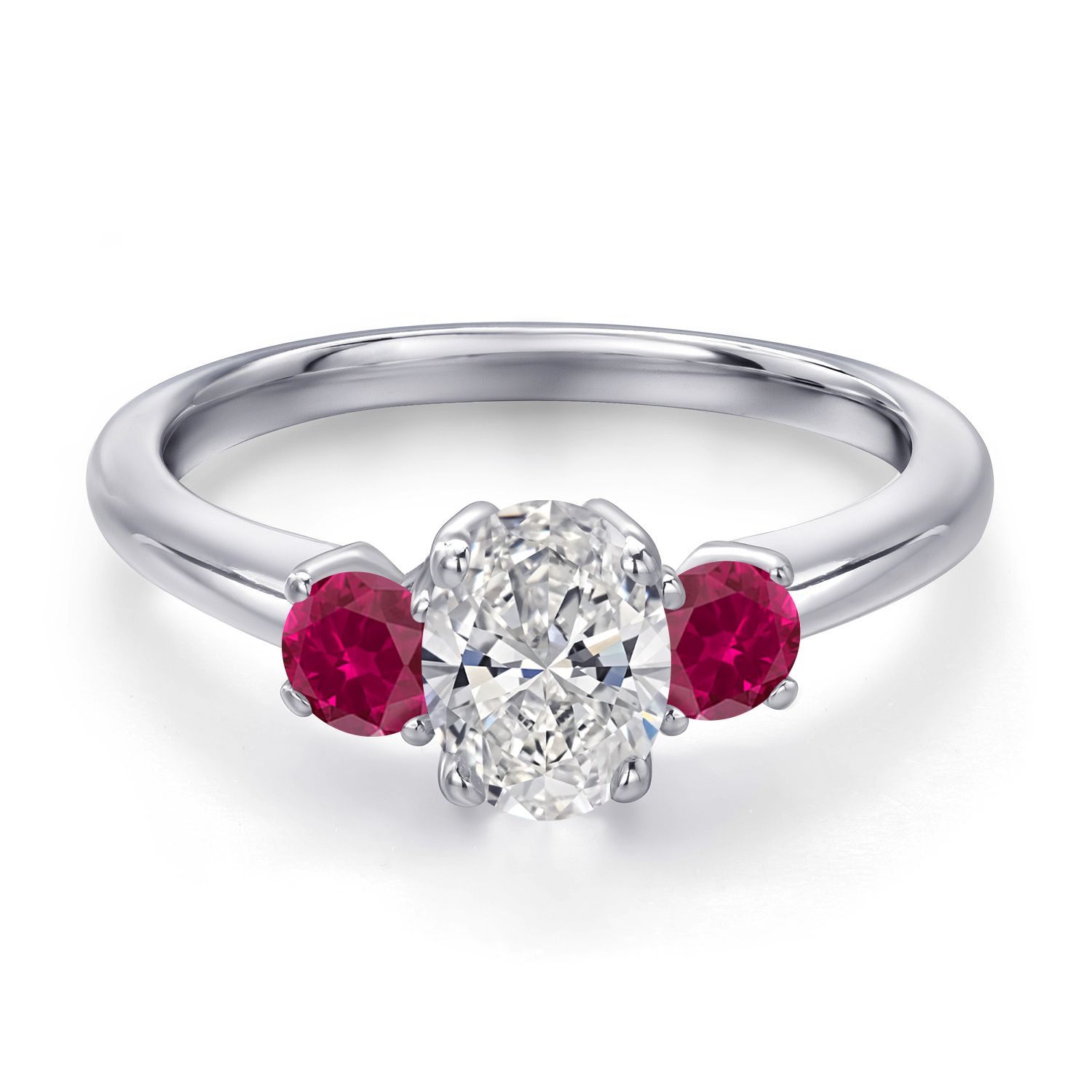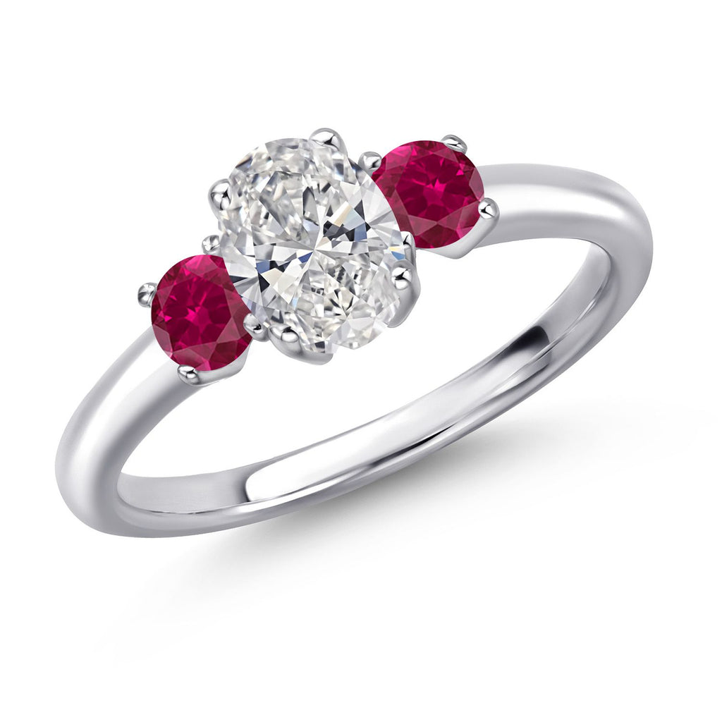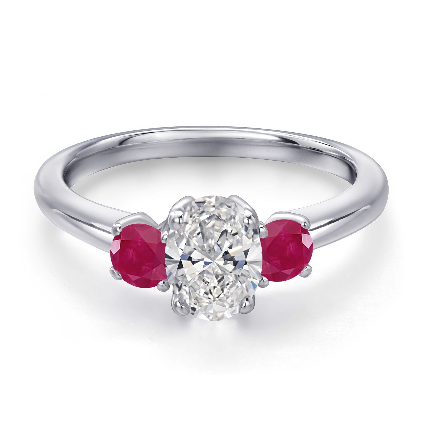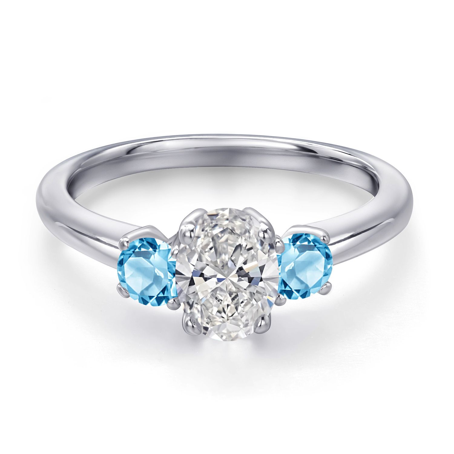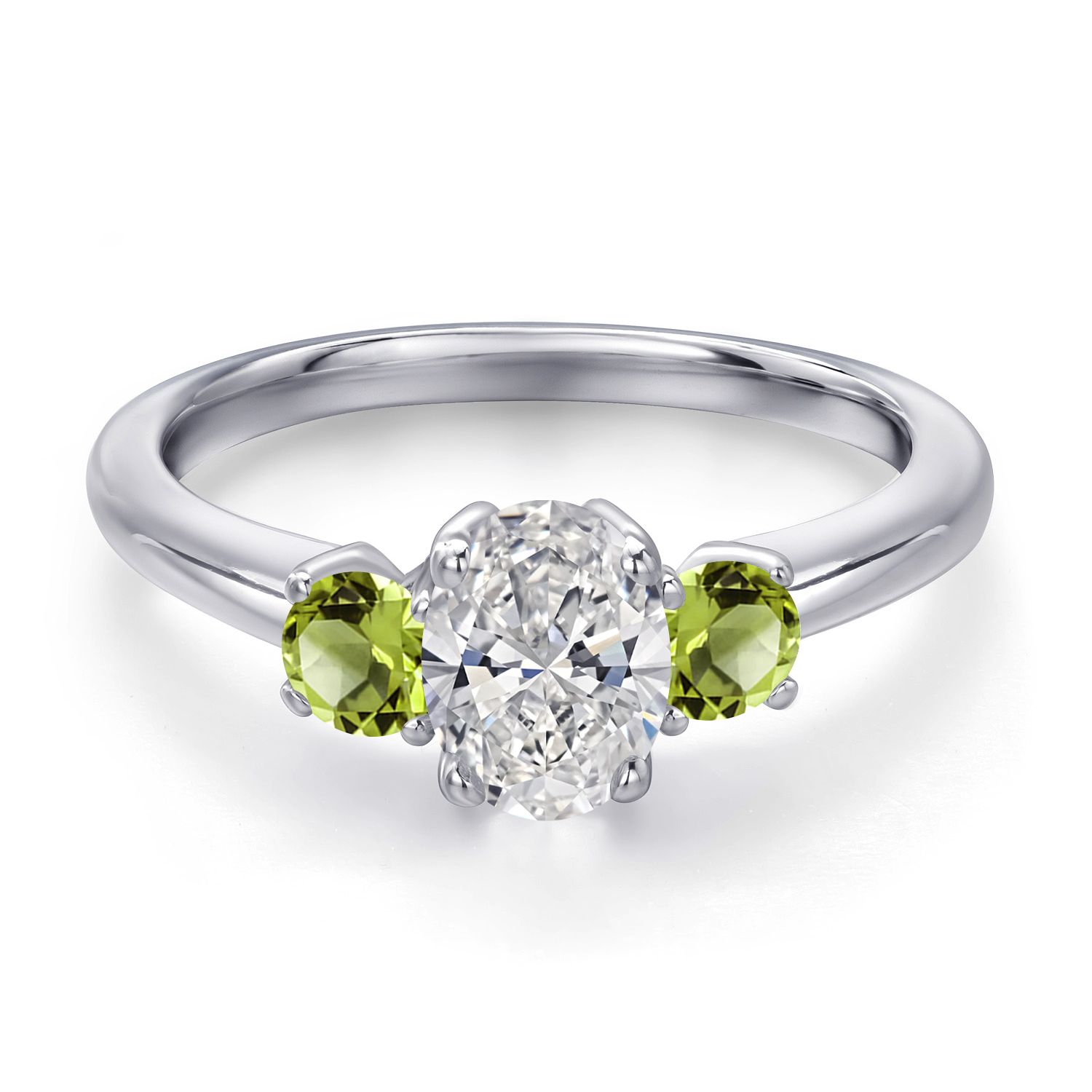 White Lab Grown Diamond and Gemstone Birthstone 3-Stone Engagement Ring for Women in 925 Sterling Silver | Oval 7X5MM and Round 3MM | Wedding Anniversary Promise Ring | Sizes 5, 6, 7, 8, 9