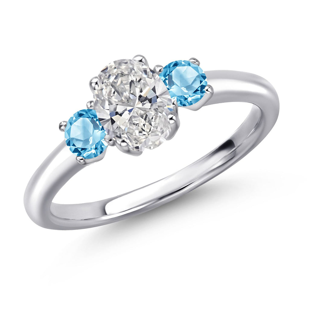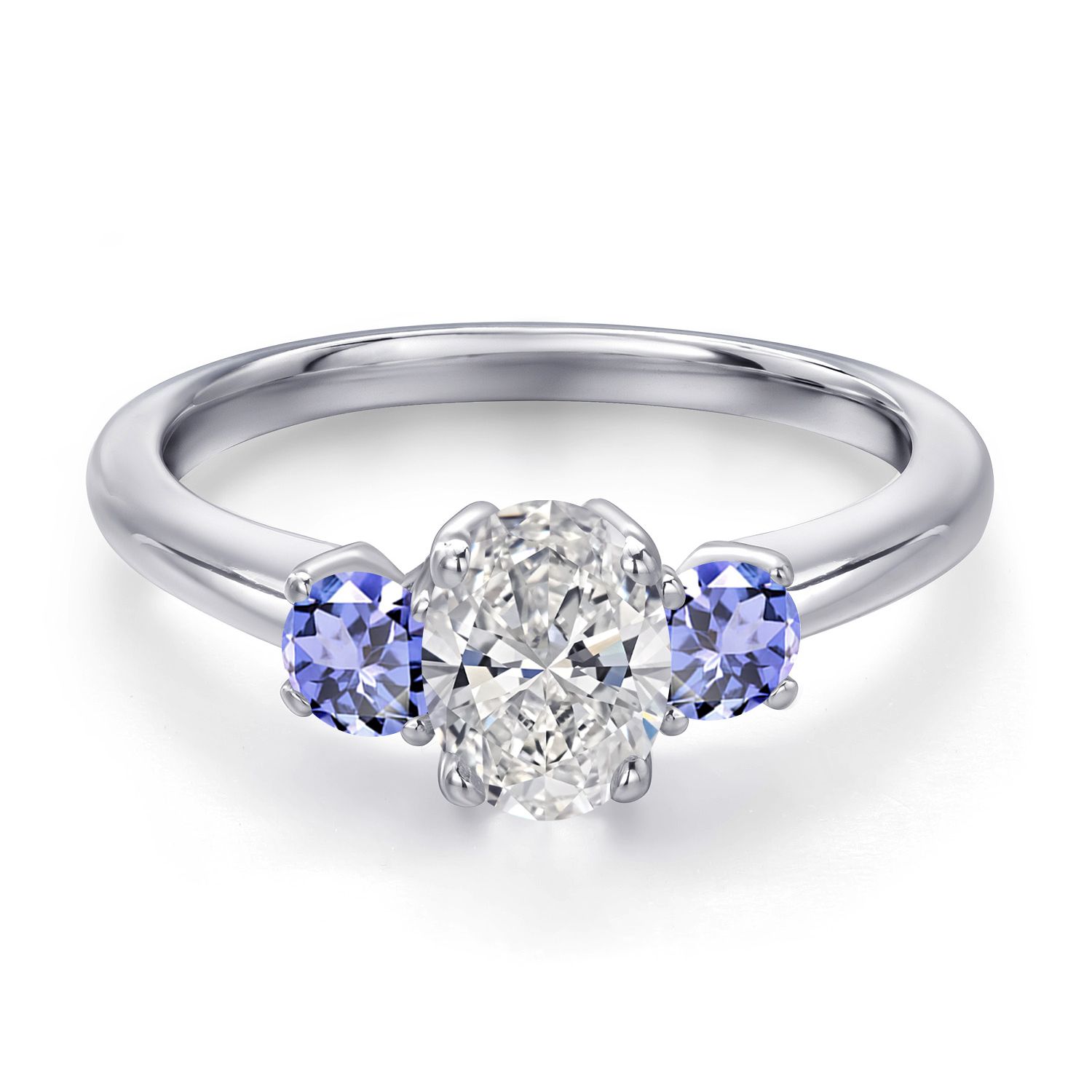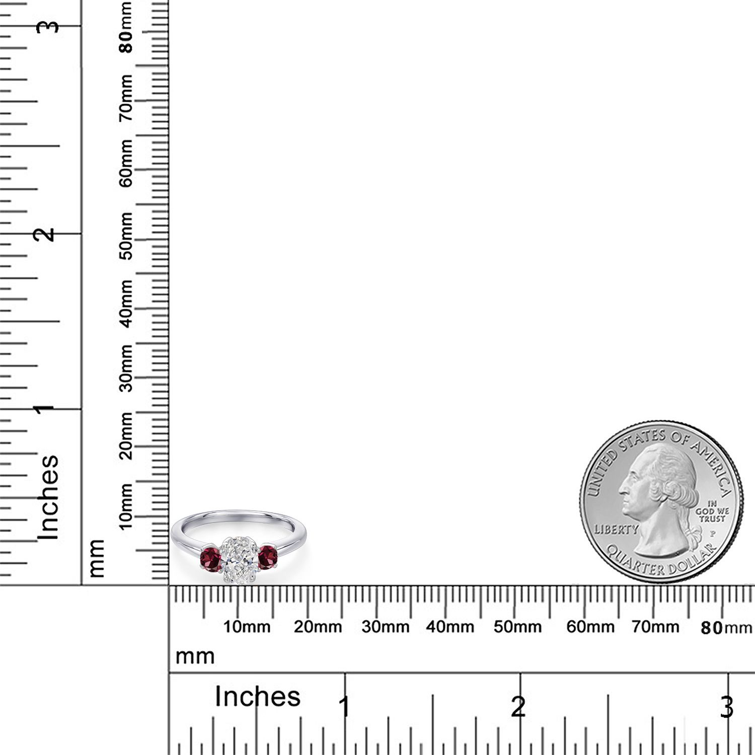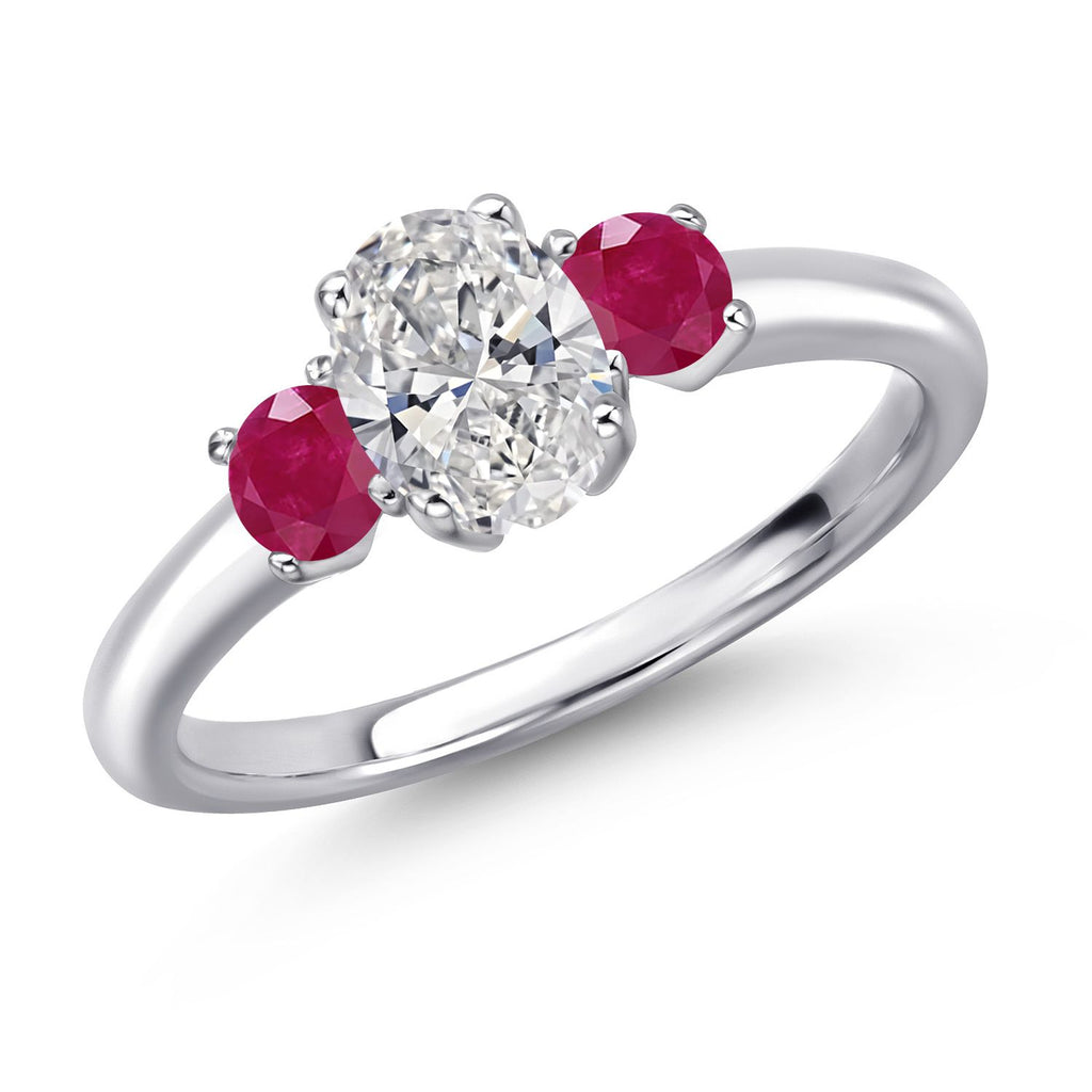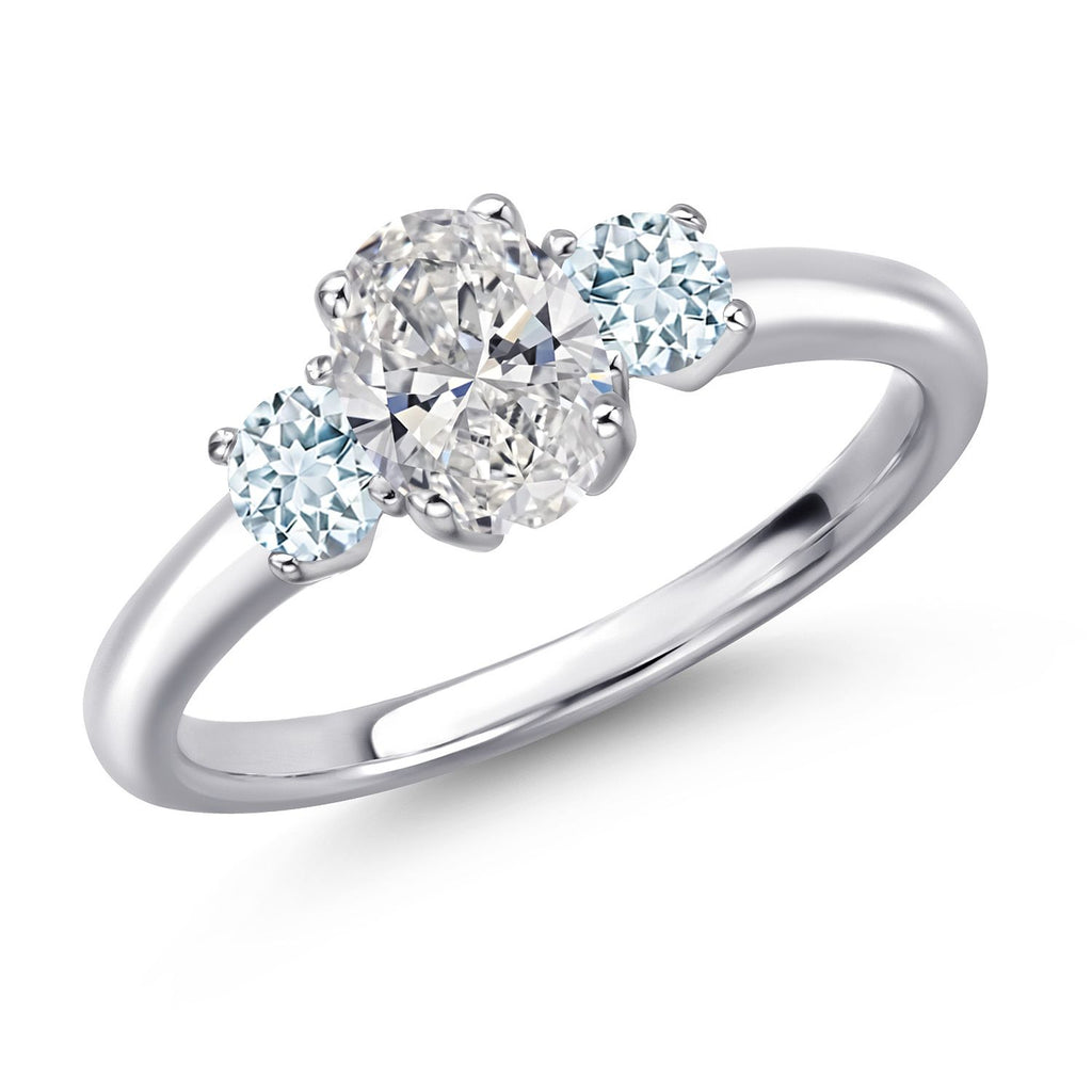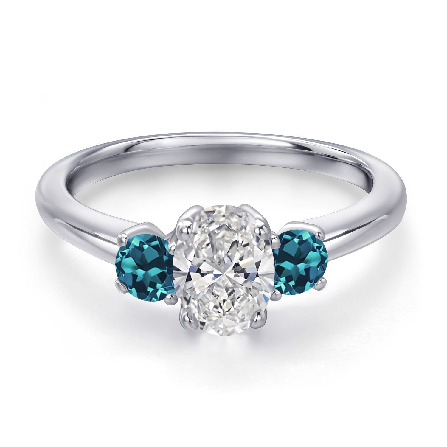 White Lab Grown Diamond and Gemstone Birthstone 3-Stone Engagement Ring for Women in 925 Sterling Silver | Oval 7X5MM and Round 3MM | Wedding Anniversary Promise Ring | Sizes 5, 6, 7, 8, 9