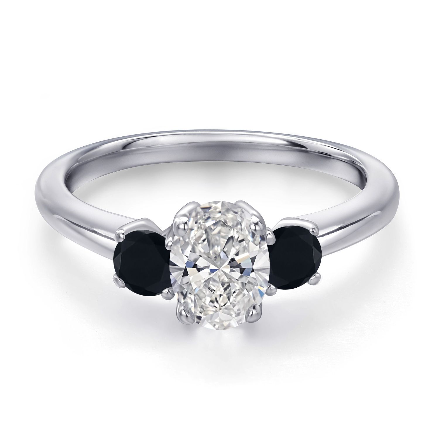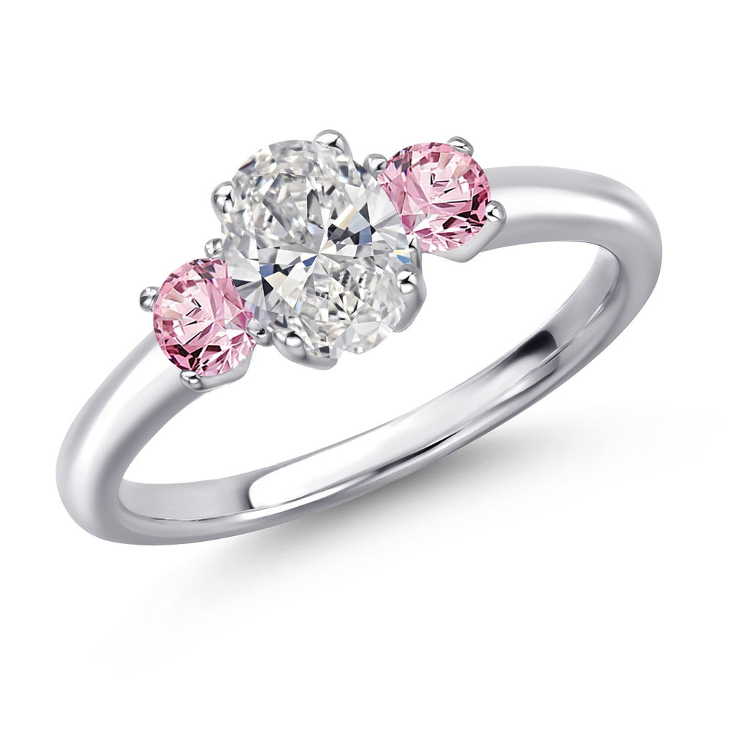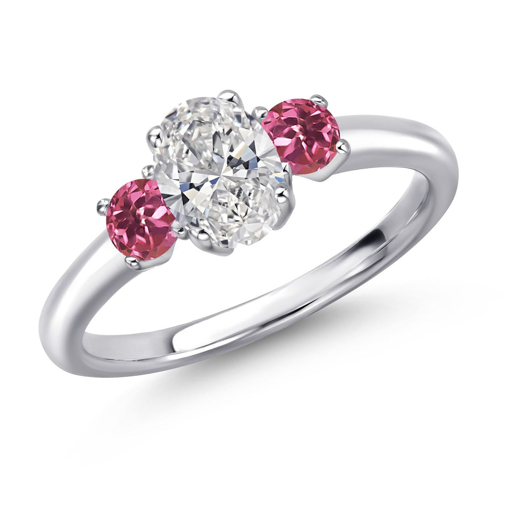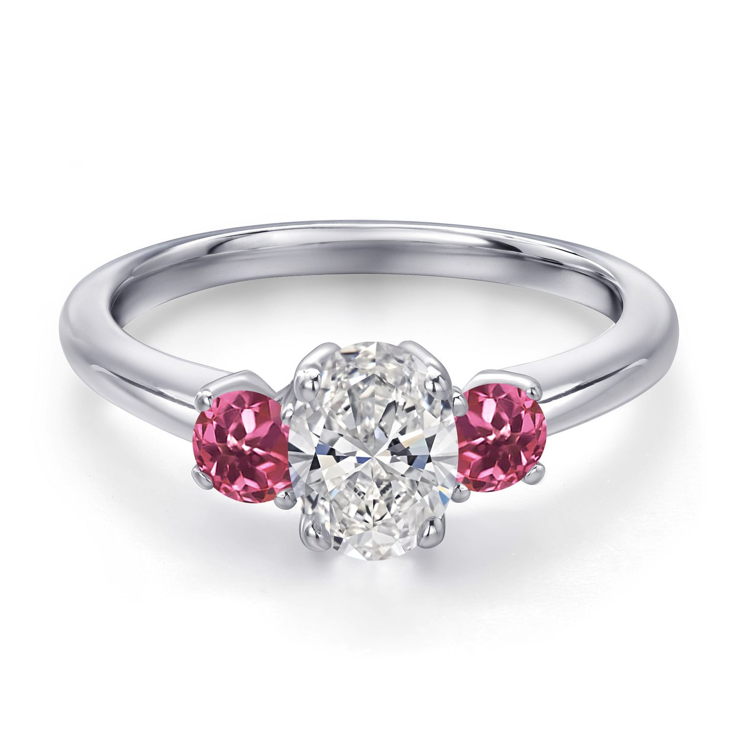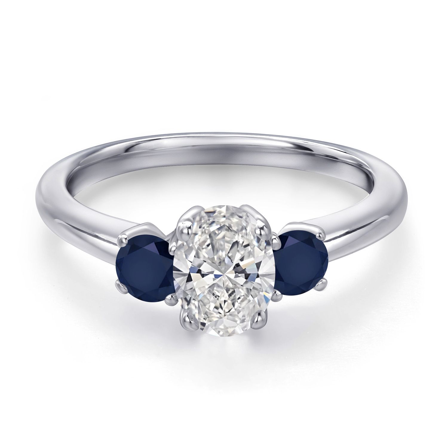 White Lab Grown Diamond and Gemstone Birthstone 3-Stone Engagement Ring for Women in 925 Sterling Silver | Oval 7X5MM and Round 3MM | Wedding Anniversary Promise Ring | Sizes 5, 6, 7, 8, 9