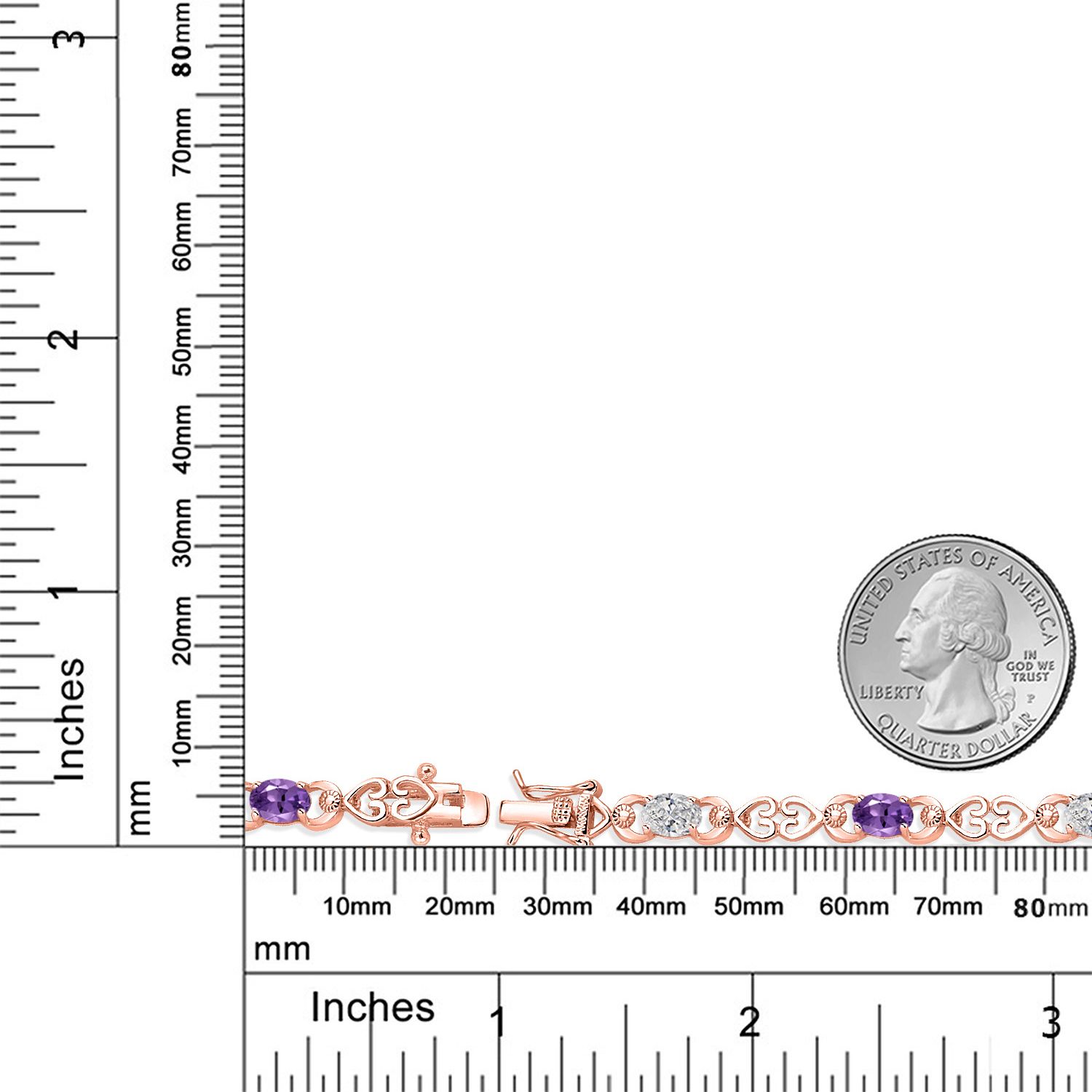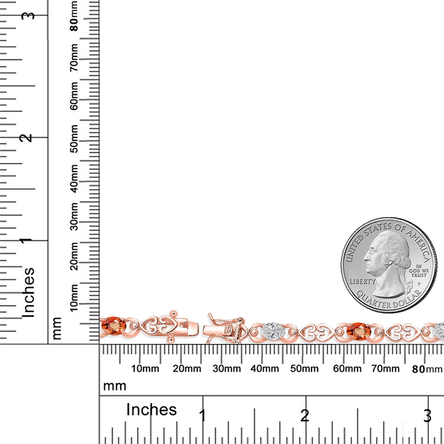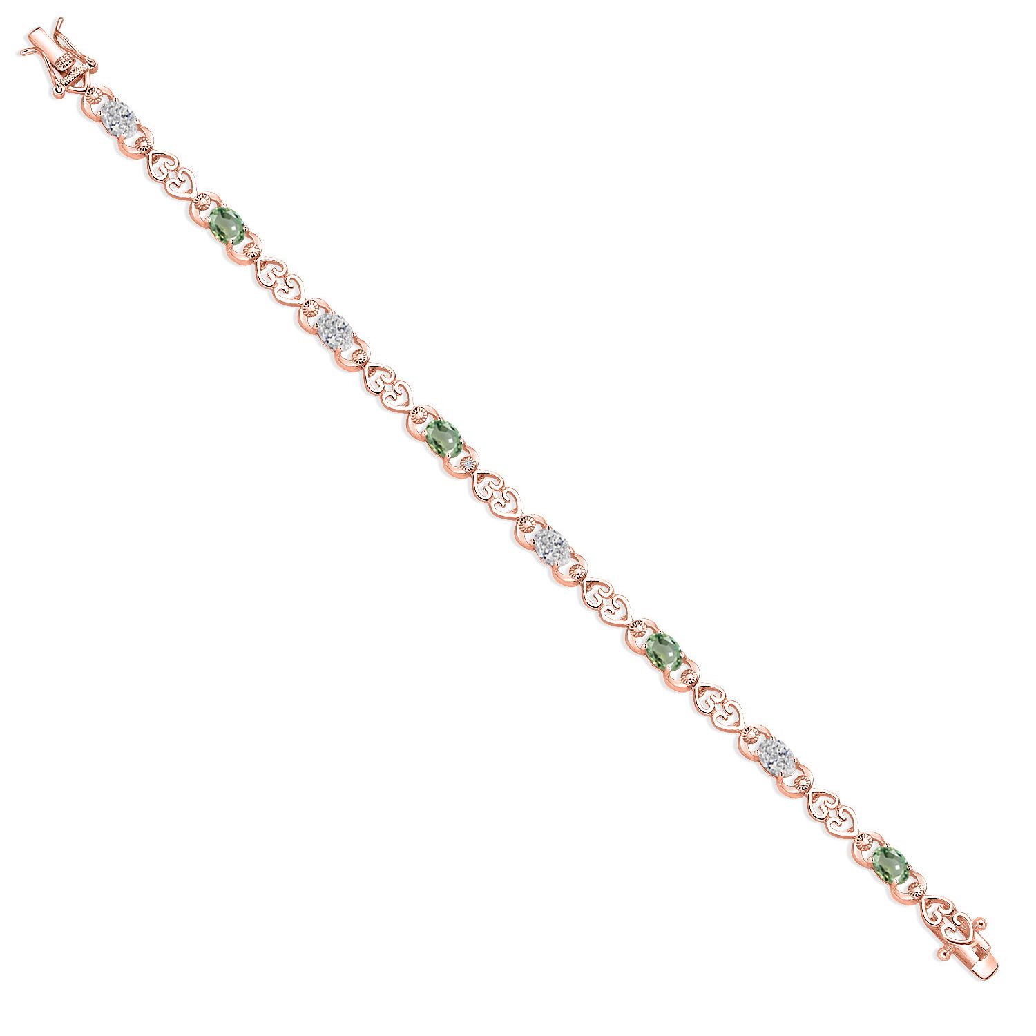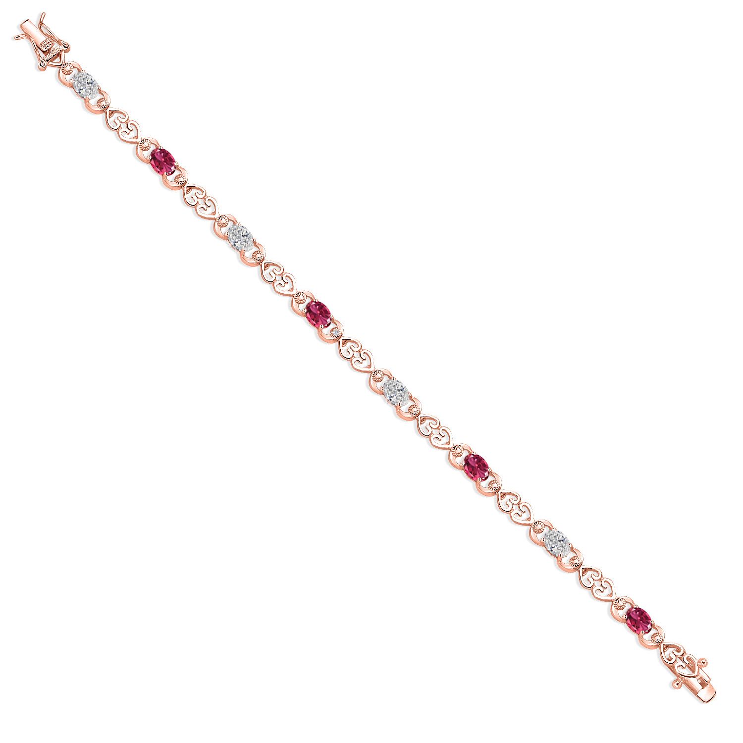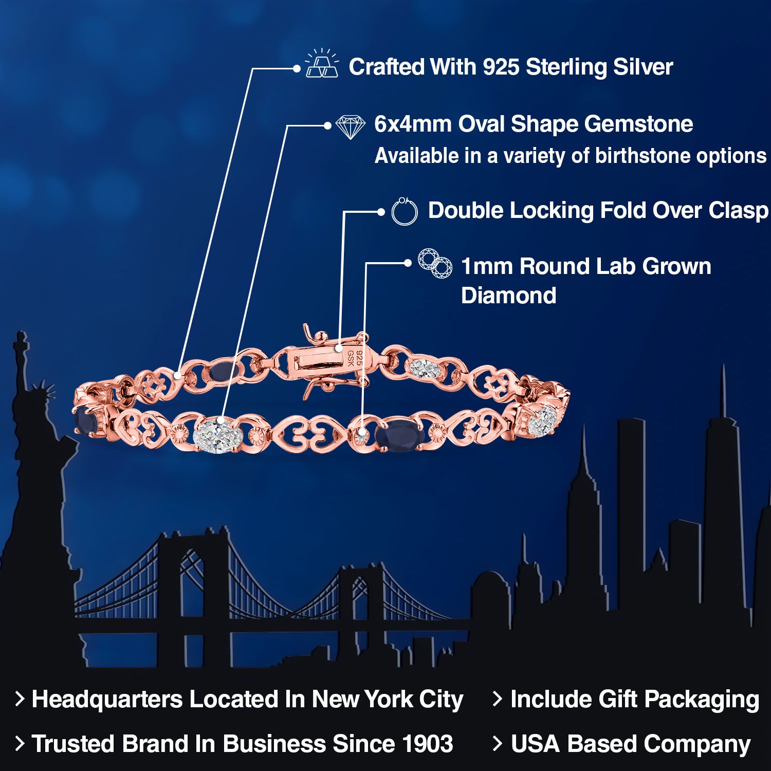 White Lab Grown Diamond and Gemstone Birthstone Heart Link Tennis Bracelet for Women | 18K Rose Gold Plated Silver | Oval 6X4MM | 7.25 Inch Length | Double Locking Fold Over Clasp